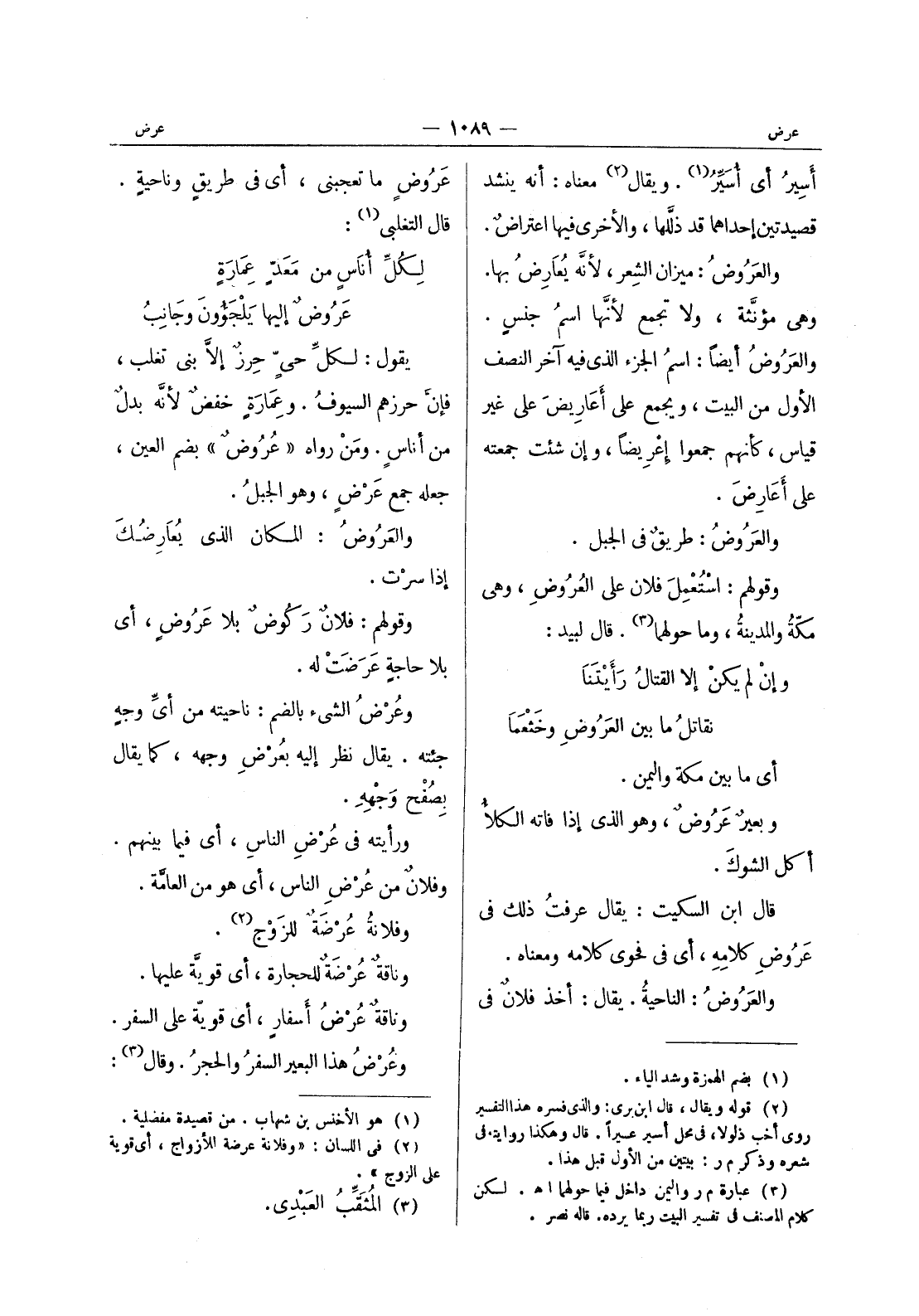 أسير أي أسير (¬1) . ويقال (¬2) معناه: أنه ينشد قصيدتين إحداهما قد ذللها، والاخرى فيها اعتراض. والعروض: ميزان الشعر، لانه يُعارِضُ بها. وهي مؤنَّثة، ولا تجمع لأنَّها اسمُ جنسٍ. والعَروضُ أيضاً: اسمُ الجزء الذي فيه آخر النصف الأول من البيت، ويجمع على أعاريضَ على غير قياس، كأنَّهم جمعوا إعْرِيضاً، وإن شئت جمعته على أَعارِضَ. والعَروضُ: طريق في الجبل. وقولهم: استعمل فلان على العروض، وهي مكَّة والمدينة، وما حولَهما (¬3) . قال لبيد: وإن لم يكن إلا القتال رأيتنا * نقاتل ما بين العروض وخثعما * أي ما بين مكة واليمن. وبعير عروض، وهو الذي إذا فاته الكلأ أكل الشوكَ. قال ابن السكيت: يقال عرفتُ ذلك في عَروضِ كلامِهِ، أي في فحوى كلامه ومعناه. والعَروضُ: الناحيةُ. يقال: أخذ فلان في