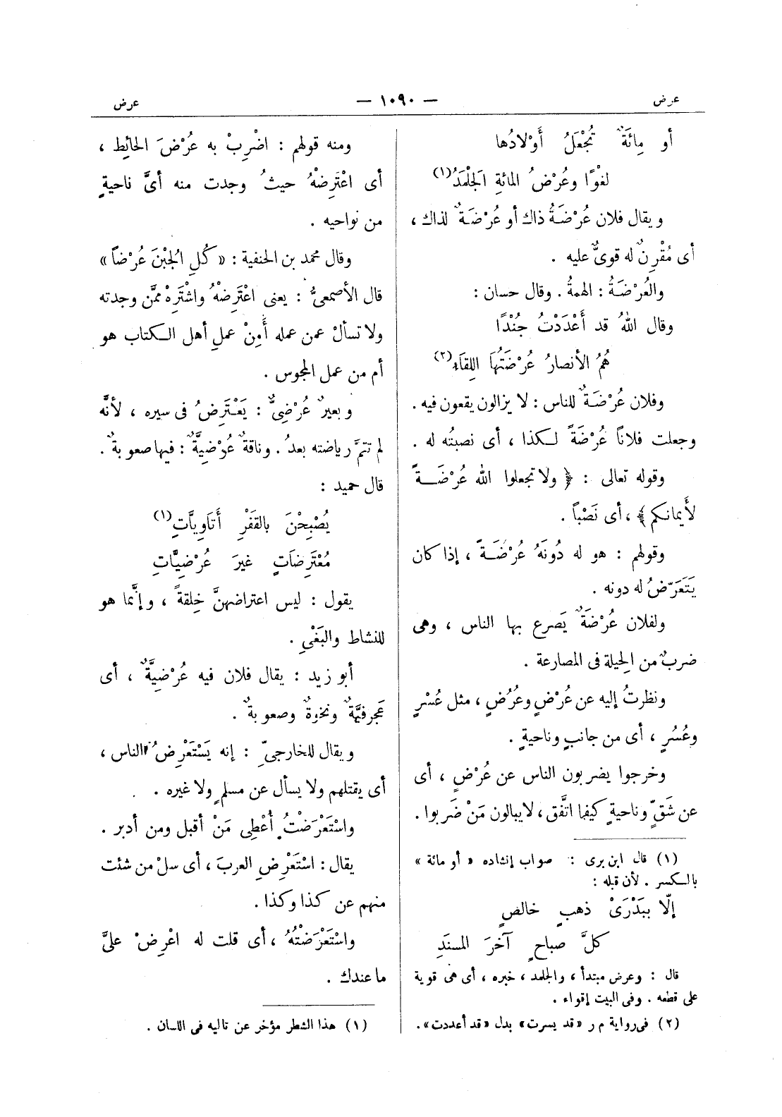 ومنه قولهم: اضْرِبْ به عُرْضَ الحائط، أي اعْتَرِضْهُ حيثُ وجدت منه أي ناحية من نواحيه. وقال محمد بن الحنفية: " كل الجبن عرضا " قال الاصمعي: يعنى اعترضه واشتره ممن وجدته ولا تسأل عمن عمله أمن عمل أهل الكتاب هو أم من عمل المجوس. وبعير عُرْضِيٌّ: يَعْتَرِضُ في سيره، لأنَّه لم تتمَّ رياضته بعدُ. وناقةٌ عُرْضِيَّةٌ: فيها صعوبةٌ. قال حميد: يُصْبِحنَ بالقَفْرِ أتاوِيَّاتِ (¬1) * مُعْتَرِضاتٍ غيرَ عُرْضِيَّاتِ * يقول: ليس اعتراضهنَّ خِلقةً، وإنَّما هو للنشاط والبَغي. أبو زيد: يقال فلان فيه عُرْضِيَّةٌ، أي عَجرفِيَّةٌ ونخوةٌ وصعوبةٌ. ويقال للخارجيِّ: إنه يَسْتَعْرِضُ الناس، أي يقتلهم ولا يسأل عن مسلمٍ ولا غيره. واسْتَعْرَضْتُ أُعْطي مَن أقبل ومن أدبر. يقال: اسْتَعْرِضِ العربَ، أي سلْ من شئت منهم عن كذا وكذا. واسْتَعْرَضْتُهُ، أي قلت له اعْرِضْ عليَّ ما عندك.