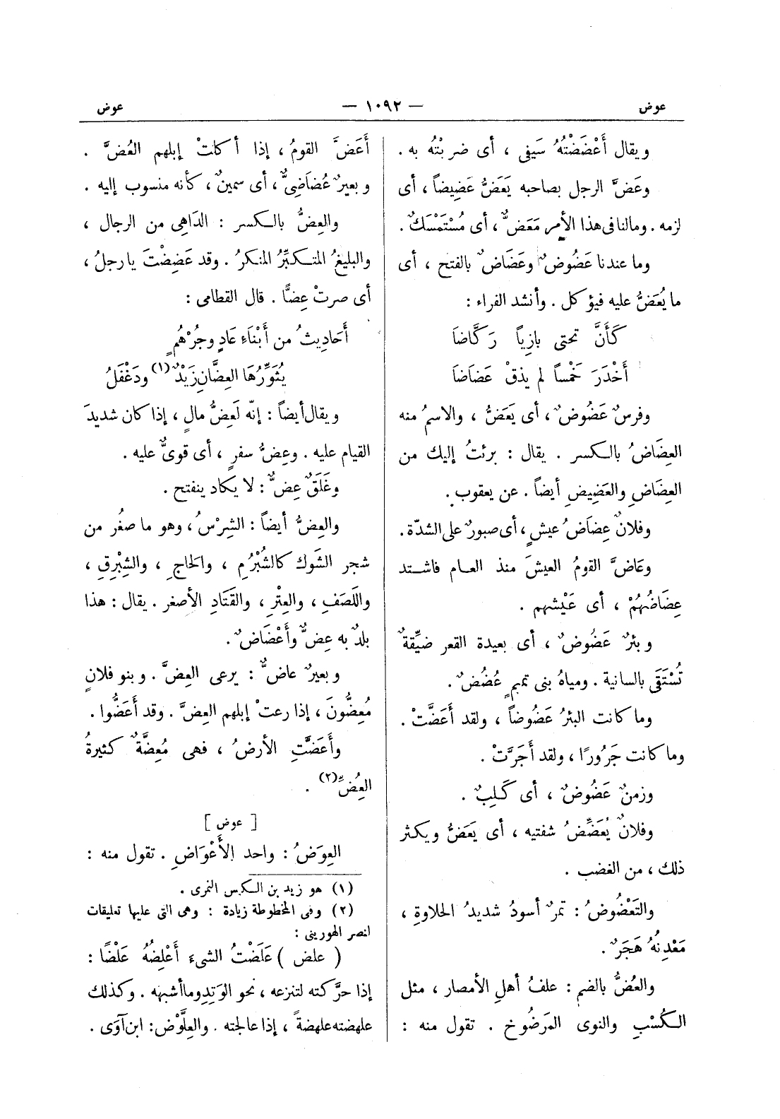 أعض القوم، إذا أكلت إبلهم العُضُّ. وبعيرٌ عُضاضِيٌّ، أي سمينٌ، كأنه منسوب إليه والعِضُّ بالكسر: الداهي من الرجال، والبليغُ المتكبِّر المنكرُ. وقد عَضِضْتَ يا رجل، أي صرت عِضًّا. قال القطامى: أحاديث من أبناء عاد وجرهم * يثورها العضان زيد (¬1) ودغفل * ويقال أيضاً: إنه لعِضُّ مالٍ، إذا كان شديد القيام عليه. وعِضُّ سفرٍ، أي قويٌّ عليه. وغَلَقٌ عِضٌّ: لا يكاد ينفتح. والعِضُّ أيضاً: الشرس، وهو ما صَغُر من شجر الشوك كالشُبْرُمِ، والحاجِ، والشِبْرِقِ، واللَصَفِ، والعِتْرِ، والقَتادِ الأصغر. يقال: هذا بلدٌ به عِضٌّ وأعْضاضٌ. وبعيرٌ عاضٌّ: يرعى العِضَّ. وبنو فلان مُعِضُّون، إذا رعت إبلهم العِضَّ. وقد أعَضُّوا. وأعَضَّتِ الأرض، فهي مُعِضَّةٌ كثيرةُ العض (¬2) .