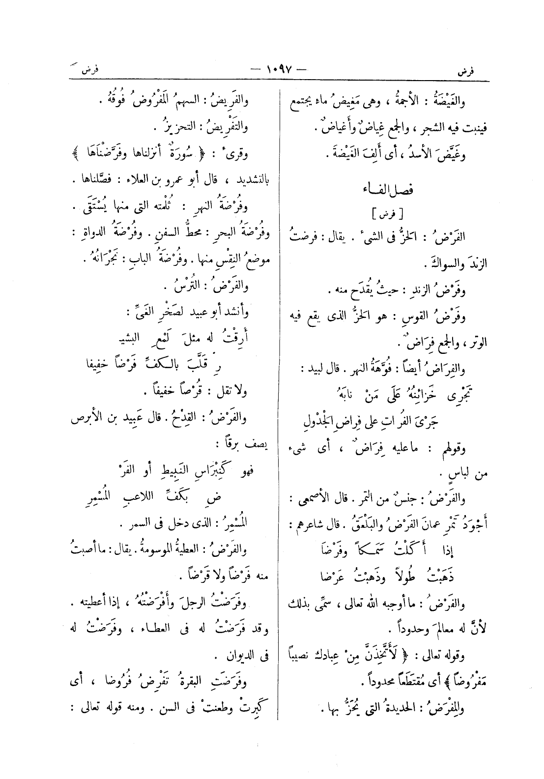 والفريض: السهم المفروض فوقه. والتفريض: التحزيز. وقرئ: {سورة أنزلناها وفرضناها} بالتشديد، قال أبو عمرو بن العلاء: فصلناها. وفرضة النهر: ثَلْمته التي منها يُستقى. وفُرْضَةُ البحر: محطُّ السفن. وفُرْضَةُ الدواةِ: موضع النِقْسِ منها. وفُرْضَةُ الباب: نجرانه. والفرض: الترس. وأنشد أبو عبيد لصخر الغى: أرقت له مثل لمع البشي * ر قلب بالكف فرضا خفيفا * ولا تقل: قرصا خفيفا. والفرض: القدح. قال عبيد بن الابرص يصف برقا: فهو كنبراس النبيط أو الفر * ض بكف اللاعب المسمر * المسمر: الذى دخل في السمر. والفرض: العطية الموسومة. يقال: ما أصبتُ منه فَرْضاً ولا قَرْضاً. وفَرَضْتُ الرجلَ وأفْرَضْتُهُ، إذا أعطيته. وقد فَرَضْتُ له في العطاء، وفَرَضْتُ له في الديوان. وفَرَضَتِ البقرةُ تَفْرِضُ فُروضاً، أي كَبِرَتْ وطعنت في السنّ. ومنه قوله تعالى: