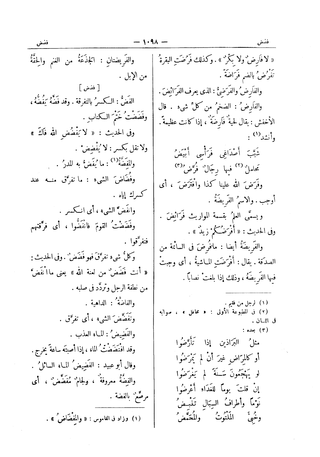 " لا فارض ولا بِكْرٌ ". وكذلك فَرُضَتِ البقرةُ تَفْرُضُ بالضم فَراضَةً. والفارِضُ والفَرَضِيُّ: الذي يعرف الفرائض. والفارِضُ: الضخمُ من كل شئ. قال الاخفش: يقال لحية فارضة، إذا كانت عظيمة. وأنشد (¬1) : شيب أصداغى فرأسي أبيض * محامل (¬2) فيها رجال فرض (¬3) * وفرض الله علينا كذا وافْتَرَضَ، أي أوجب. والاسمُ الفريضَةُ. ويسمَّى العلمُ بقسمة المواريث فرائِضَ. وفي الحديث: " أفْرَضُكُمْ زيدٌ ". والفريضَةُ أيضاً: ما فُرض في السائمة من الصدقة. يقال: أفْرَضَتِ الماشيةُ، أي وجبت فيها الفَريضَةُ، وذلك إذا بلغت نصابا.