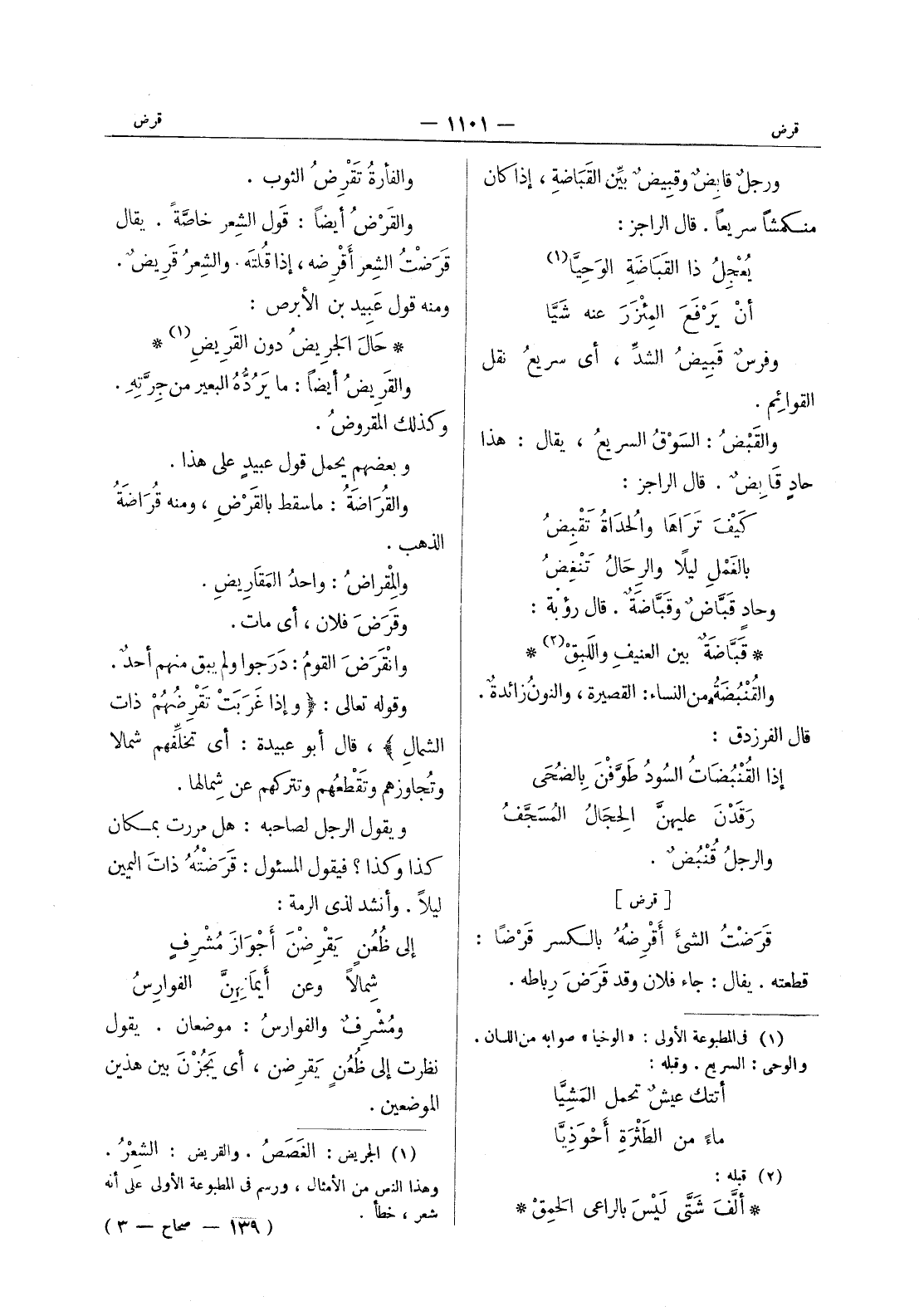 حال الجريض دون القريض (¬1) * والقريض أيضاً: ما يرُدُّهُ البعير من جرته. وكذلك المقروض. وبعضهم يحمل قول عبيد على هذا. والقراضة: ما سقط بالقَرْضِ، ومنه قُراضَةُ الذهب. والمِقْراضُ: واحد المقاريضِ. وقَرَضَ فلانٌ، أي مات. وانْقَرَضَ القومُ: دَرَجوا ولم يبقَ منهم أحدٌ. وقوله تعالى: {وإذا غَرَبَتْ تَقْرِضُهُمْ ذات الشمالِ} ، قال أبو عبيدة: أي تخلِّفهم شمالاً وتجاوزهم وتَقْطعهم وتتركهم عن شمالها. ويقول الرجل لصاحبه: هل مررت بمكان كذا وكذا؟ فيقول المسئول: قَرَضْتُهُ ذاتَ اليمين ليلا. وأنشد لذى الرمة: إلى ظعن يقرضن أجواز مشرف * شمالا وعن أيمانهن الفوارس * ومشرف والفوارس: موضعان. يقول نظرت إلى ظعن يقرضن، أي يجزن بين هذين الموضعين.
