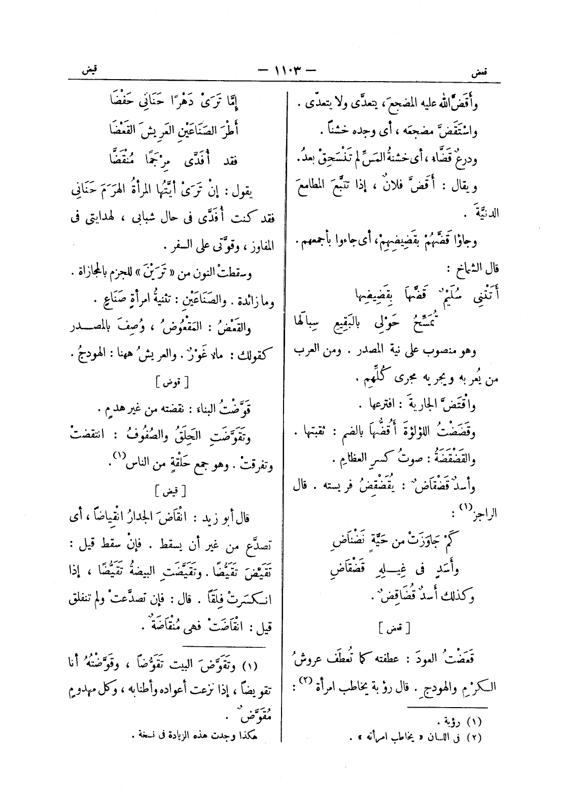 (¬1) وتقوض البيت تقوضا، وقوضته أنا تقويضا، إذا نزعت أعواده وأطنابه، وكل مهدوم مقوض. هكذا وجدت هذه الزيادة في نسخة.