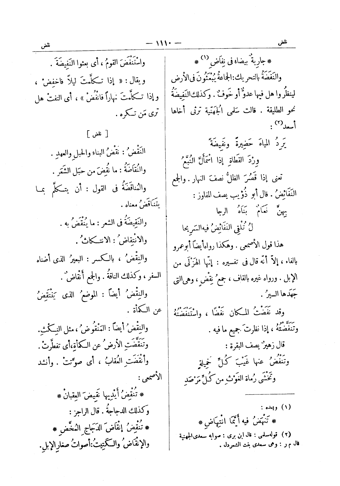 * جارية بيضاء في نفاض (¬1) * والنفضة بالتحريك: الجماعة يُبْعَثونَ في الأرض لينظروا هل فيها عدوٌّ أو خوفٌ. وكذلك النفيضة نحو الطليقة. قالت سلمى الجُهَنيّة تَرْثي أخاها أسعَدَ (¬2) : يَرِد المياه حضيرَةً ونَفيضةً * وِرْدَ القطاةِ إذا اسْمَأَلَّ التُبَّعُ * تعني إذا قَصُرَ الظلُّ نصفَ النهار. والجمع النفائض. قال أبو ذؤيب يصف المفاوز: بهن نعام بناه الرجا * ل تلقى النفائض فيه السريحا * هذا قول الاصمعي. وهكذا رواه أيضا أبو عمرو بالفاء، إلا أنه قال في تفسيره: إنها الهزلى من الابل. ورواه غيره بالقاف، جمع نقض، وهى التى جهدها السير. وقد نفضت المكان نفضا، واسْتَنْفَضْتُهُ وتَنَفَّضْتُهُ، إذا نظرت جميع ما فيه. قال زهير يصف البقرة: وتَنْفُضُ عنها غَيْبَ كُلِّ خميلةٍ * وتخشى رُماة الغَوْثِ من كل مرصد *