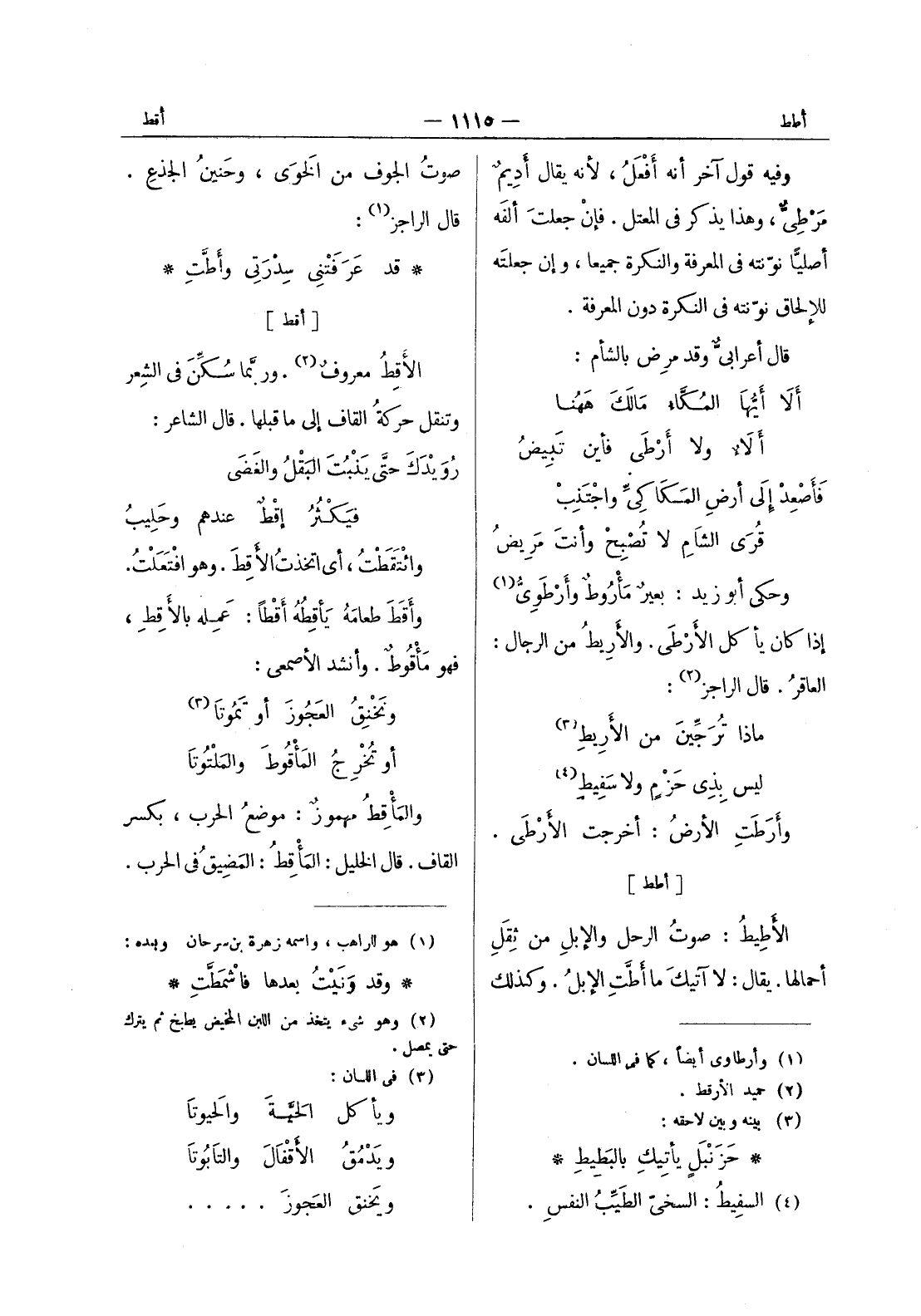 [أطط] الأَطيطَ: صوتُ الرحل والإِبلِ من ثِقلِ أحمالها. يقال: لا آتيك ما أطت الابل. وكذلك
