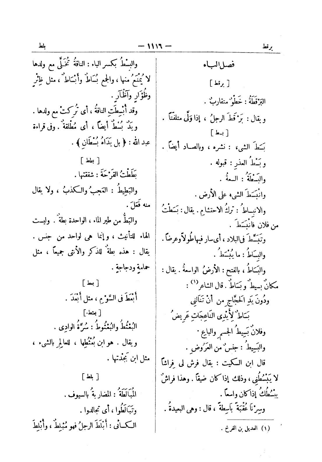 [بسط] بسط الشئ: نشره، وبالصاد أيضاً. وبَسْطُ العذرِ: قبوله. والبَسْطَةُ: السعة. وانبسط الشئ على الارض. والانبِساطُ: تركُ الاحتشامِ. يقال: بَسَطْتُ من فلان فانْبَسَطَ. وتَبَسَّطَ في البلاد، أي سار فيها طولاً وعرضاً. والبِساطُ: ما يُبْسَطُ. والبِساطُ، بالفتح: الأرضُ الواسعةُ. يقال: مكانٌ بسيطٌ وبَساطٌ. قال الشاعر (¬1) : ودونَ يَدِ الحَجَّاجِ من أنْ تَنالني * بَساطٌ لأَِيْدي الناعِجاتِ عَريضُ * وفلانٌ بَسيطُ الجسمِ والباعِ. والبَسيط: جنسٌ من العروض. قال ابن السكيت: يقال فرش لى فراشا لا يبسطني، وذلك إذا كان ضيقا. وهذا فراش يبسطك إذا كان واسعا. وسرنا عقبة باسطة، قال: وهى البعيدة.