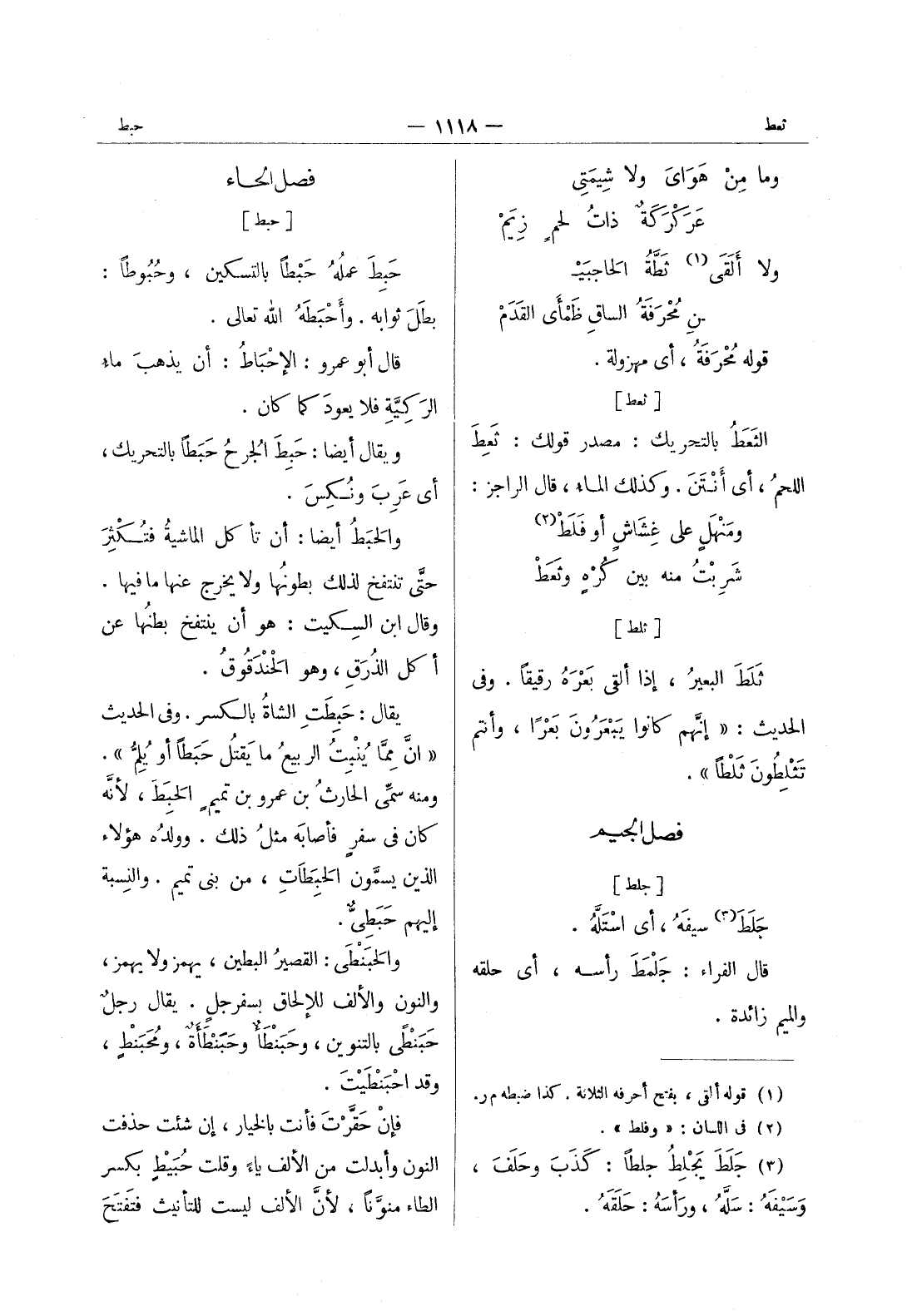 [حبط] حَبِطَ عملُهُ حَبْطاً بالتسكين، وحُبوطاً: بطَلَ ثوابه. وأَحْبَطَهُ الله تعالى. قال أبو عمرو: الاحباط: أن يذهب ماء الرَكِيَّةِ فلا يعودَ كما كان. ويقال أيضاً: حَبِطَ الجُرحُ حَبَطاً بالتحريك، أي عَرِبَ ونُكِسَ. والحَبَطُ أيضاً: أن تأكل الماشيةُ فتُكْثِرَ * حتَّى تنتفخ لذلك بطونُها ولا يخرج عنها ما فيها * وقال ابن السكيت: هو أن ينتفخ بطنها عن أكل الذرق، وهو الحندقوق. يقال: حبطت الشاةُ بالكسر. وفي الحديث " إنَّ مِمَّا يُنْبِتُ الربيعُ ما يَقتُل حبطا أو يلم ". ومنه سمى الحارث بن عمرو بن تميم الحبط، لانه كان في سفر فأصابه مثل ذلك. وولده هؤلاء الذين يسمون الحبطات، من بنى تميم. والنسبة إليهم حبطى. والحبنطى: القصير البطين، يهمز ولا يهمز، والنون والالف للالحاق بسفرجل. يقال رجل حبنطى بالتنوين، وحبنطأ وحبنطأة، ومحبنط، وقد احبنطيت. فإن حقرت فأنت بالخيار، إن شئت حذفت النون وأبدلت من الالف ياء وقلت حبيط بكسر الطاء منونا، لان الالف ليست للتأنيث فتفتح