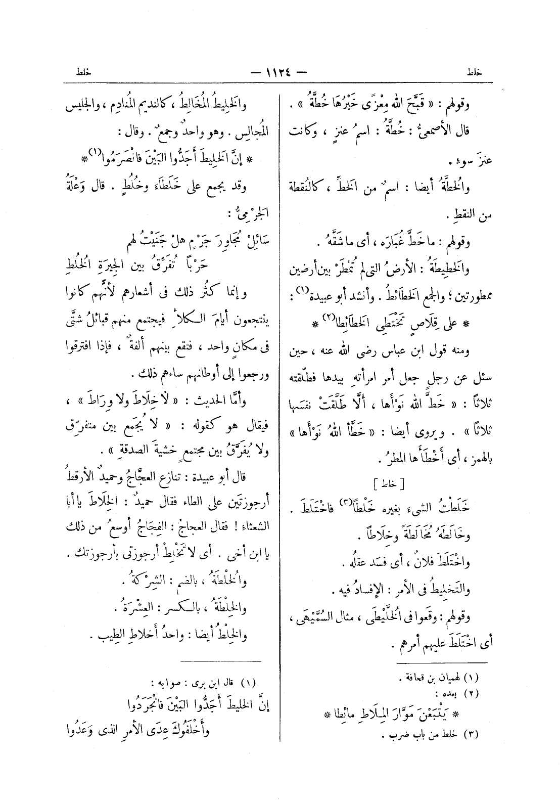 إنَّ الخليطَ أَجَدَّوا البين فانصرموا (¬1) * وقد يجمع على خَلَطاءَ وخُلُطٍ. قال وَعْلَةُ الجَرْميُّ: سائِلْ مُجاوِرَ جَرْمٍ هلْ جَنَيْتُ لهم * حَرباً تُفَرِّقُ بين الجيرَةِ الخلط * وإنما كثر ذلك في أشعارهم لانهم كانوا ينتجعون أيام الكلا فيجتمع منهم قبائل شتى في مكان واحد، فتقع بينهم ألفة، فإذا افترقوا ورجعوا إلى أوطانهم ساءهم ذلك. وأما الحديث: " لا خلاط ولا وِراطَ "، فيقال هو كقوله: " لا يُجمَع بين متفرِّق ولا يُفَرَّقُ بين مجتمعٍ خشيةَ الصدقةِ ". قال أبو عبيدة: تنازع العجاج وحميد الارقط أرجوزتين على الطاء فقال حميد: الخلاط يا أبا الشعثاء! فقال العجاج: الفجاج أوسع من ذلك يا ابن أخى. أي لا تخلط أرجوزتي بأرجوزتك. والخُلْطَةُ، بالضم: الشِرْكةُ. والخِلْطَةُ، بالكسر: العِشْرَةُ. والخِلْطُ أيضاً: واحدُ أَخْلاطِ الطيب.