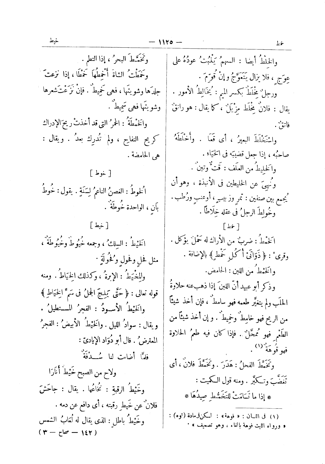 [خيط] الخَيْطُ السِلكُ، وجمعه خُيوطٌ وخيوطة، مثل فحل وفحول وفحولة. والمخيط: الابرة، وكذلك الخياط. ومنه قوله تعالى: {حَتَّى يَلِجَ الجملُ في سَمِّ الخِياطِ} والخَيْطُ الأسودُ: الفجرُ المستطيلُ. ويقال: سوادُ الليل. والخَيْطُ الأبيضُ: الفجرُ المعترضُ. قال أبو دُواد الإياديّ: فلمَّا أضاءت لنا سُدْفَةٌ * ولاح من الصبح خَيْطٌ أَنارا * وخَيْطُ الرقبةِ: نُخاعُها. يقال: جاحَشَ فلانٌ عن خَيطِ رقبته، أي دافع عن دمه. وخَيْطُ باطلٍ: الذي يقال له لعاب الشمس (142 - صحاح - 3)