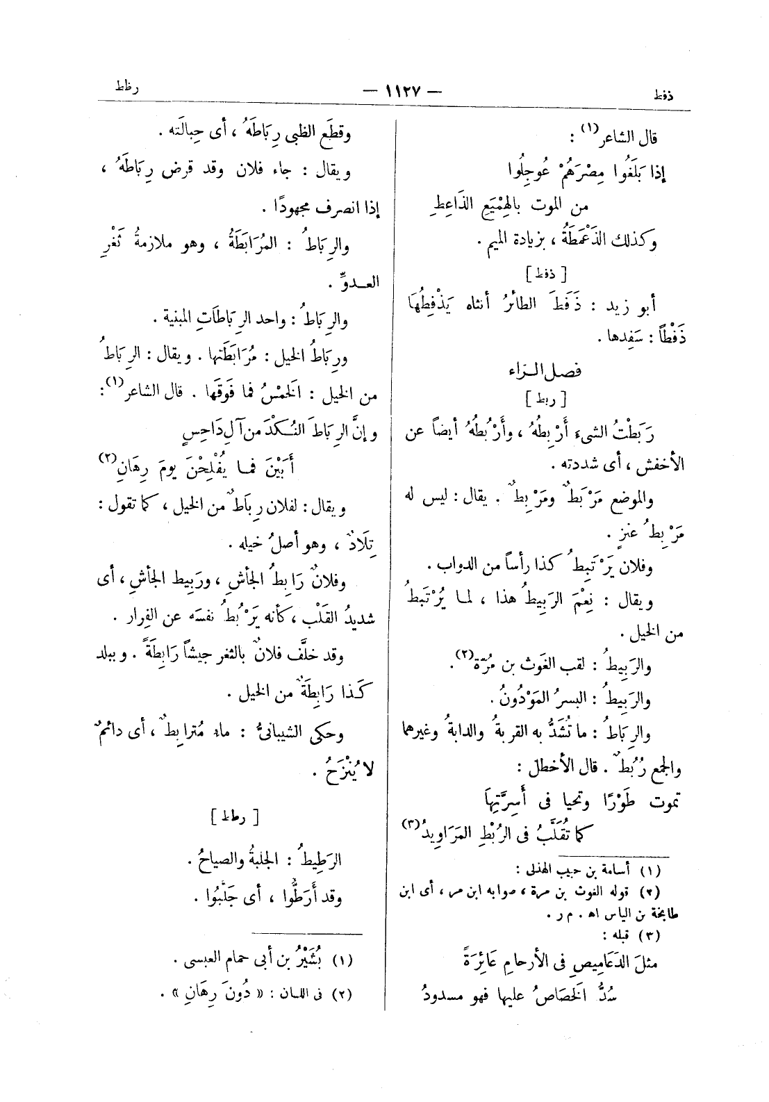 وقطع الظبى رباطه، أي حِبالَتَه. ويقال: جاء فلان وقد قرض رِباطَهُ، إذا انصرف مجهوداً. والرِباطُ: المُرابَطَةُ، وهو ملازمة ثَغْرِ العدوِّ. والرِباطُ: واحد الرِباطاتِ المبنية. ورِباطُ الخيل: مُرابَطَتها. ويقال: الرِباطُ من الخيل: الخَمْسُ فما فَوْقَها. قال الشاعر (¬1) : وإنَّ الرِباطَ النُكْدَ من آلِ داحِسٍ * أَبَيْنَ فما يُفْلِحْنَ يومَ رِهانِ (¬2) * ويقال: لفلان رِباطٌ من الخيل، كما تقول: تِلادٌ، وهو أصلُ خيله. وفلانٌ رابِطُ الجأشِ، ورَبيط الجأشِ، أي شديدُ القَلْب، كأنه يَرْبُطُ نفسَه عن الفِرار. وقد خلَّف فلانٌ بالثغر جيشاً رابِطَةً. وببلد كَذا رابطة من الخيل. وحكى الشيباني: ماء مترابط، أي دائم لا ينزح.