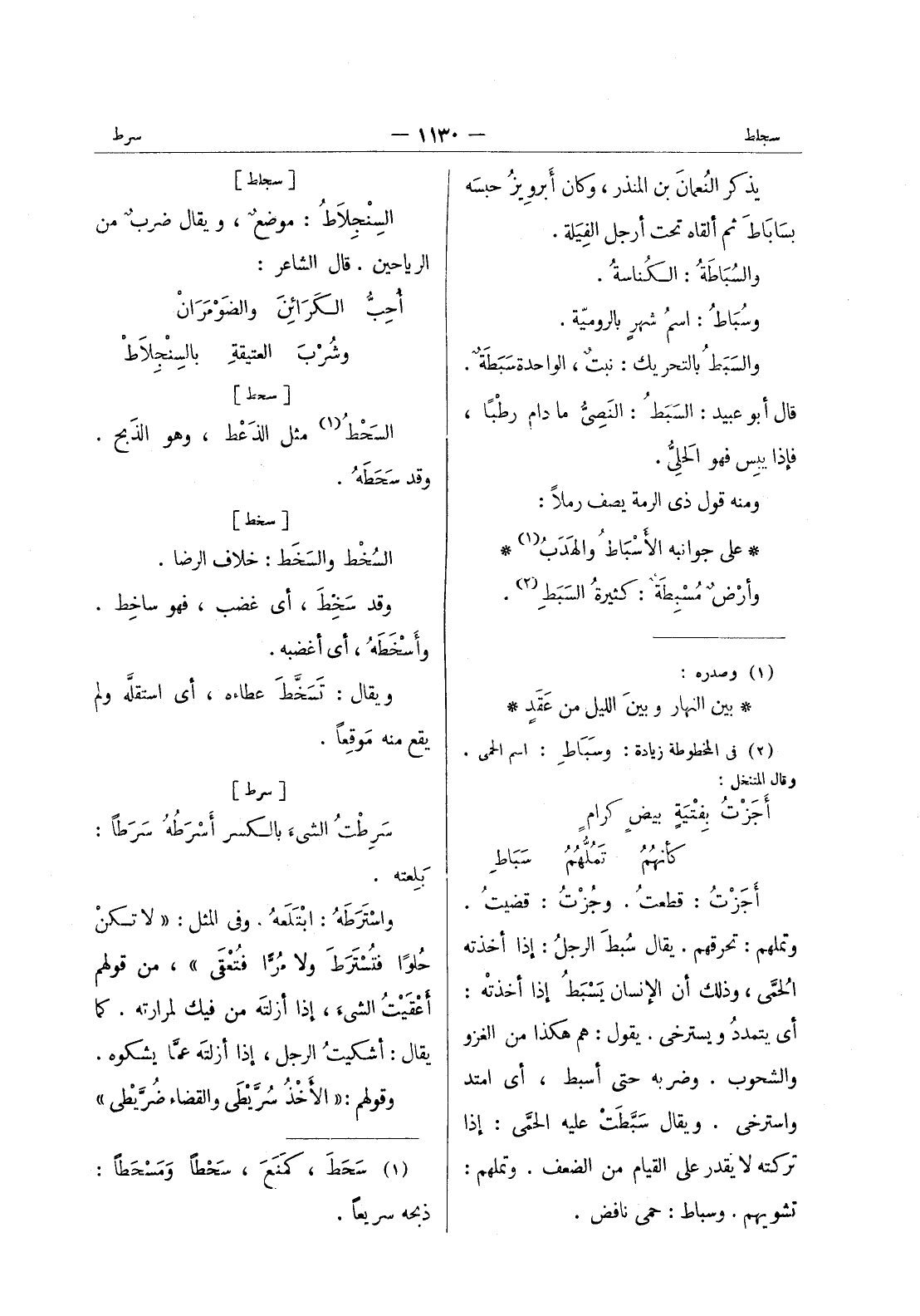 (¬2) في المخطوطة زيادة: وسباط: اسم الحمى. وقال المتنخل: أجزت بفتية بيض كرام * كأنهم تملهم سباط * أجزت: قطعت. وجزت: قضيت. وتملهم: تحرقهم. يقال سبط الرجل: إذا أخذته الحمى، وذلك أن الانسان يسبط إذا أخذته: أي يتمدد ويسترخى. يقول: هم هكذا من الغزو والشحوب. وضربه حتى أسبط، أي امتد واسترخى. ويقال سبطت عليه الحمى: إذا تركته لا يقدر على القيام من الضعف. وتملهم: تشويهم. وسباط: حمى نافض.