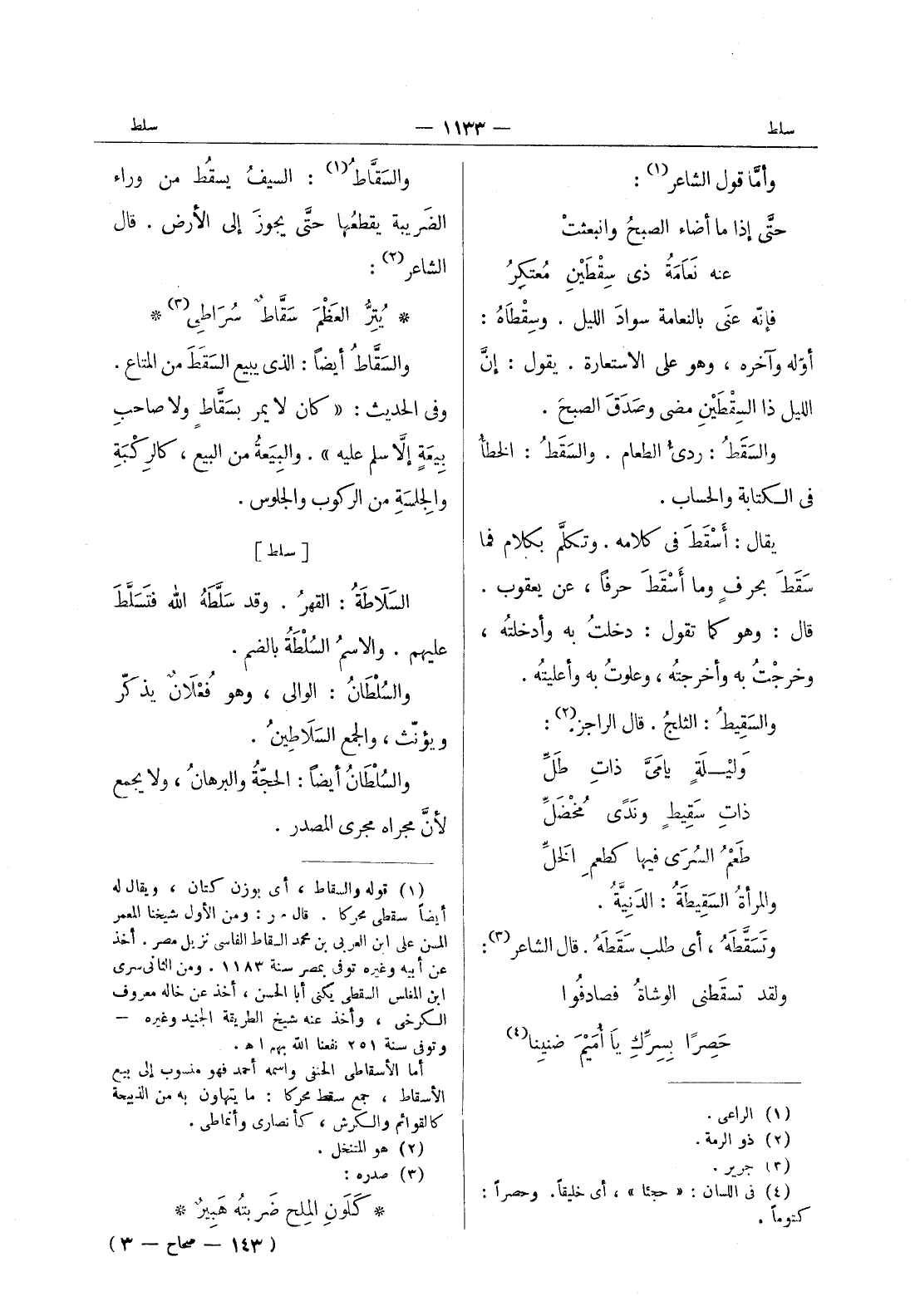 وأما قول الشاعر (¬1) : حَتى إذا ما أضاء الصبح وانبعثت * عنه نَعامَةُ ذي سِقْطَيْنِ مُعتكِرُ * فإنّه عنَى بالنعامة سوادَ الليل. وسِقْطاهُ: أوّله وآخره، وهو على الاستعارة. يقول: إنَّ الليل ذا السِقْطَيْنِ مضى وصَدَقَ الصبحُ. والسَقَطُ: ردئ الطعام. والسقط: الخطأ في الكتابة والحساب. يقال: أَسْقَطَ في كلامه. وتكلَّم بكلام فما سَقَطَ بحرف وما أسقط حرفا، عن يعقوب. قال: وهو كما تقول: دخلت به وأدخلته، وخرجت به وأخرجته، وعلوت به وأعليته. والسقيط: الثلج. قال الراجز (¬2) : وليلة يامى ذات طل * ذات سقيط وندى مخضل * طعم السرى فيها كطعم الخل * والمرأة السَقيطَةُ: الدَنِيَّةُ. وتَسَقَّطَهُ، أي طلب سَقَطَهُ. قال الشاعر (¬3) : ولقد تسقَطني الوشاةُ فصادفُوا * حَصِراً بِسِرِّكِ يا أميم ضنينا (¬4) *