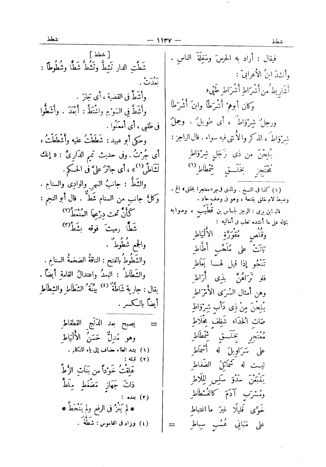 فيقال: أراد به الحرس وسفلة الناس. وأنشد ابن الاعرابي: أشاريط من أشراط أشراط طيئ * وكان أبوهم أشرطا وابن أشرطا * ورجل شِرْواطٌ، أي طويلٌ. وجملٌ شِرْواطٌ، الذكر والانثى فيه سواء. قال الراجز: يلحن من ذى زجل شرواط * محتجز بخلق شمطاط (¬1) *