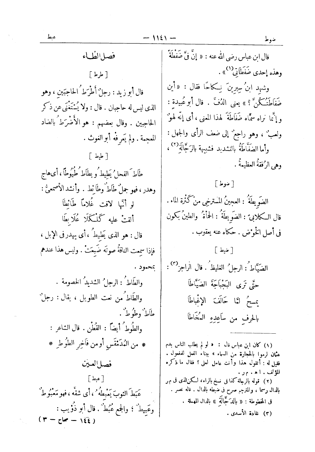 [ضيط] الضياط: الرجل الغليظ. قال الراجز (¬3) : حتى ترى البجباجة الضياطا * يمسح لما حالف الاغباطا * بالحرف من ساعده المخاطا *