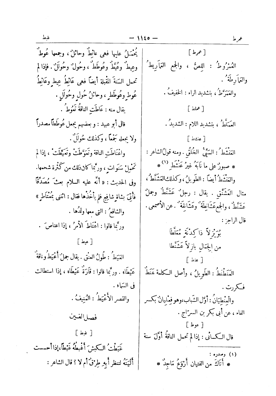 صبورٌ على ما نابَهُ غيرُ عَنْشَطِ (¬1) * والعَنْشَطُ أيضاً: الطويل، وكذلك العشنط، مثال العشنق. يقال: رجل عَشَنَّطٌ وجملٌ عَشَنَّطٌ، والجمع عَشانِطَةٌ وعشانقة. عن الاصمعي. قال الراجز: بويزلا ذا كدنة معلطا * من الجمال بازلا عشنطا