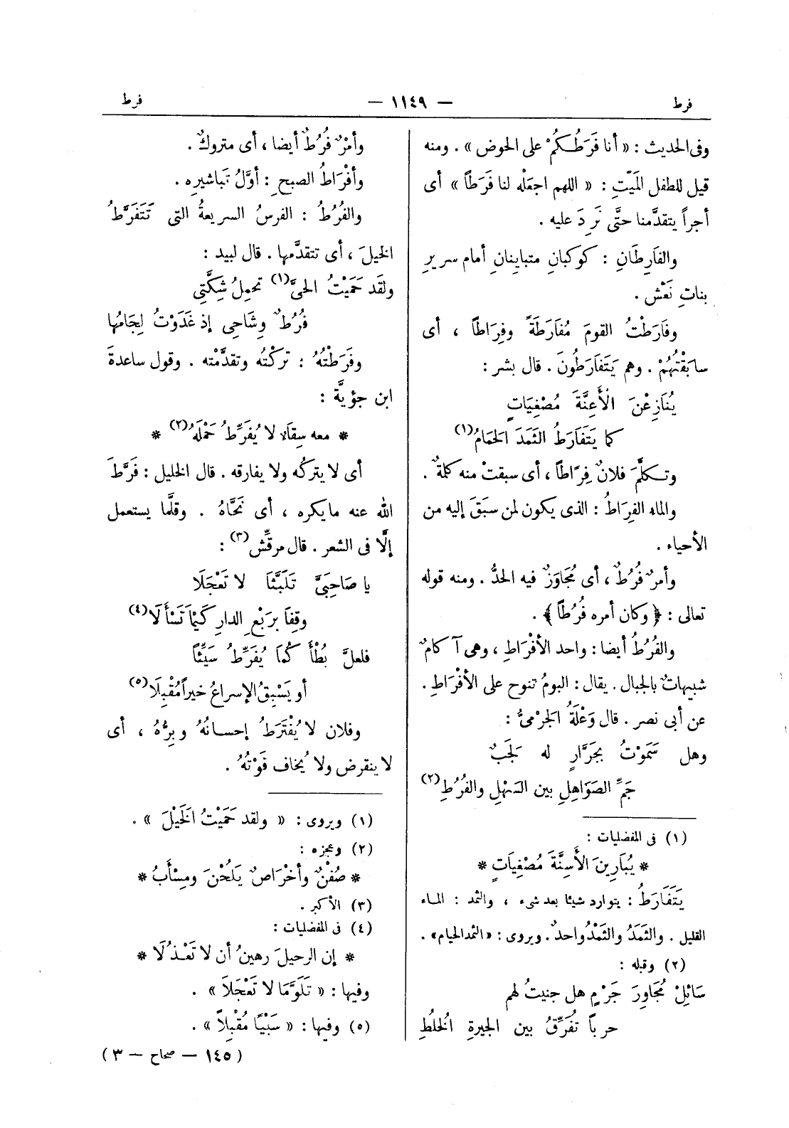 وأمر فرط أيضا، أي متروكٌ. وأفْراطُ الصبحِ: أوَّل تباشيره. والفُرُطُ: الفرسُ السريعةُ التي تَتَفَرَّطُ الخيلَ، أي تتقدَّمها. قال لبيد: ولقد حَمَيْتُ الحيَّ (¬1) تحمِلُ شِكَّتي * فُرُطٌ وِشاحي إذ غدوتُ لِجامُها * وفَرَطْتُهُ: تركته وتقدَّمته. وقول ساعدة ابن جؤية: