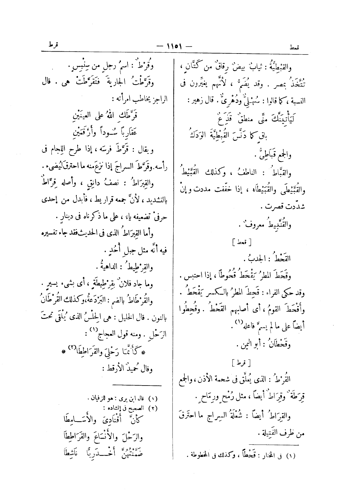 وقرط: اسم رجل من سنبس. وقرطت الجارية فتقرطت هي. قال الراجز يخاطب امرأته: قرطك الله على العينين * عقاربا سودا وأرقمين * ويقال: قَرَّطَ فرسَه، إذا طرح اللجام في رأسه. وقَرَّطَ السراجَ إذا نزع منه ما احترق ليضئ. والقيراطُ: نصفُ دانِقٍ، وأصله قِرَّاط بالتشديد، لأنَّ جمعه قَراريط، فأبدل من إحدى حرفيْ تضعيفه ياءً، عى ما ذكرناه في دينار. وأما القيراط الذى في الحديث فقد جاء تفسيره فيه أنه مثل جبل أحد. والقِرْطيطُ: الداهيةُ. وما جاد فلانٌ بقرطيطة، أي بشئ يسير. والقرطاط بالضم: البَرْدَعةُ، وكذلك القُرْطانُ بالنون. قال الخليل: هي الحِلْسُ الذي يلقى تحت الرحل. ومنه قول العجاج (¬1) :
