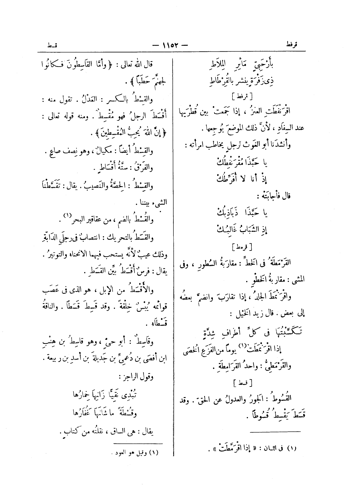قال الله تعالى: {وأمَّا القاسِطونَ فكانوا لجنهم حطبا} . والقسط بالكسر: العدل. تقول منه: أقْسَطَ الرجلُ فهو مُقْسِطٌ. ومنه قوله تعالى: {إنَّ الله يُحِبُّ المُقْسِطين} . والقِسْطُ أيضاً: مكيال، وهو نصف صاع. والفرق: ستة أقساط. والقسط: الحصة والنصيب. يقال: تقسطنا الشئ بيننا. والقُسْطُ بالضم، من عقاقير البحر (¬1) . والقسط بالتحريك: انتصاب في رجلَي الدابَّة وذلك عيبٌ لأنَّه يستحب فيهما الانحناء والتوتيرُ. يقال: فرسٌ أقْسَطُ بيِّن القَسَطِ. والأقْسَطُ من الإبل، هو الذي في عَصَب قوائمه يبسٌ خِلقةً. وقد قسط قسطا. والناقة قسطاء. وقاسط: أبو حى، وهو قاسط بن هنب ابن أفصى بن دعمى بن جديلة بن أسد بن ربيعة. وقول الراجز: تبدى نقيا زانها خمارها * وقسطة ما شانها غفارها * يقال: هي الساق، نقلته من كتاب.
