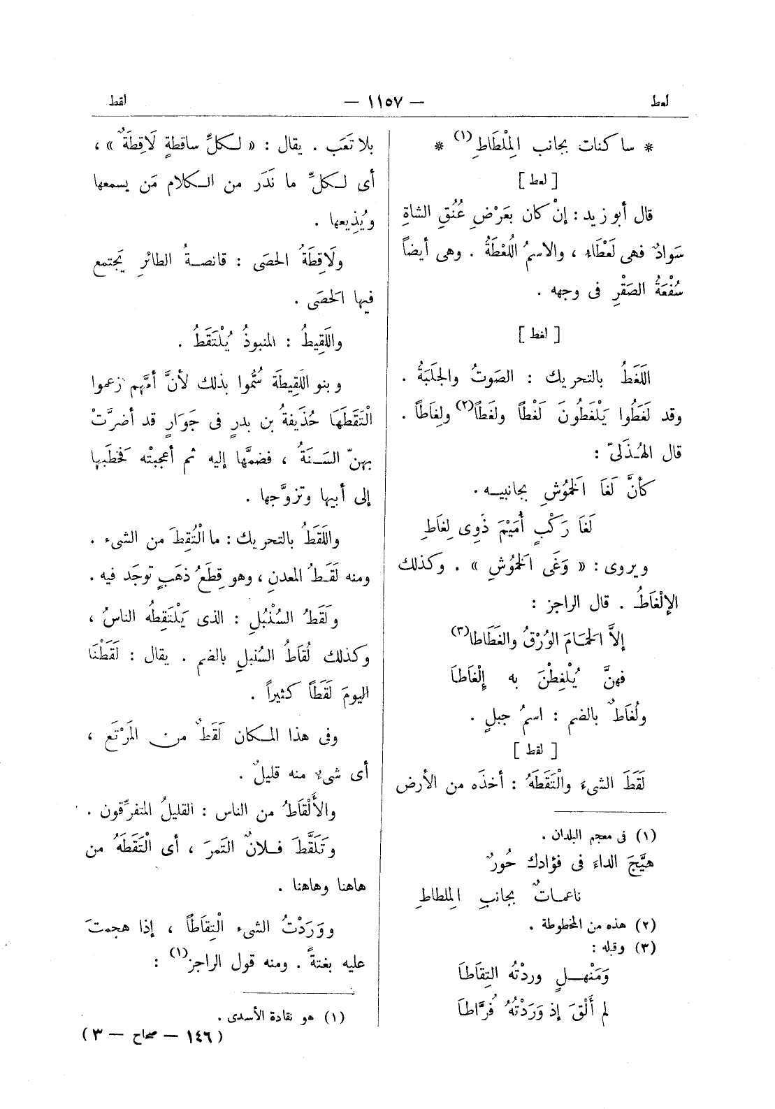 بلا تعب. يقال: " لكلِّ ساقطة لاقِطَةٌ "، أي لكلِّ ما نَدَر من الكلام من يسمعها ويُذيعها. ولاقِطَةُ الحصى: قانصة الطائرِ يجتمع فيها الحصَى. واللَقيطُ: المنبوذ يلتقط. وبنو اللقيطة سموا بذلك لان أمهم زعموا التقطعها حذيفة بن بدر في جوار قد أضرت بهن السنة، فضمها إليه ثم أعجبته فخطبها إلى أبيها وتزوجها. واللقط بالتحريك: ما التقط من الشئ. ومنه لقط المعدنِ، وهو قِطَعُ ذهبٍ توجد فيه. ولَقَطُ السُنْبُلِ: الذي يَلْتَقِطُهُ الناسُ، وكذلك لُقاطُ السُنبلِ بالضم. يقال: لَقَطْنا اليومَ لَقَطاً كثيراً. وفي هذا المكان لَقَطٌ من المرتع، أي شئ منه قليل. والألْقاطُ من الناس: القليل المتفرِّقون. وتَلَقَّطَ فلانٌ التَمرَ، أي التَقَطَهُ من هاهنا وهاهنا. ووردت الشئ التقاطا، إذا هجمت عليه بغتةً. ومنه قول الراجز (¬1)