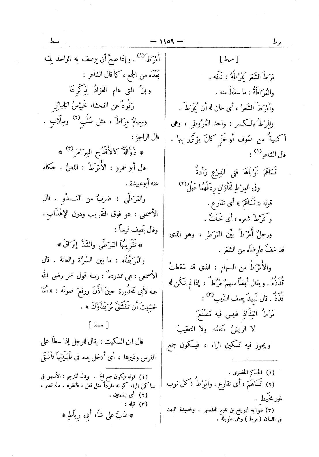 [مرط] مَرَطَ الشَعَر يَمْرُطُهُ: نَتَفَه. والمراطة: ما سقط منه. وأمْرَطَ الشعرُ، أي حان له أن يُمْرَطَ. والمِرْطُ بالكسر: واحد المروطِ، وهي أكسيةٌ من صوف أو خَزٍّ كان يؤتزر بها. قال الشاعر (¬1) : تَساهَمَ ثَوْباها ففي الدِرْعِ رَأدة * وفي المِرْطِ لَفَّاوانِ رِدْفُهُما عَبْلُ (¬2) * قوله " تساهمَ " أي تقارع. وتَمَرَّطَ شعره، أي تَحاتَّ. ورجلُ أمْرَطُ بيِّن المَرَطِ، وهو الذي قد خفَّ عارِضاه من الشعر. والامرط من السهام: الذى قد سقطتْ قُذَذُهُ. ويقال أيضاً سهمٌ مُرُطٌ، إذا لم تكن له قذذ. قال لبيد يصف الشيب (¬3) : مرط القذاذ فليس فيه مصنع * لا الريش ينفعه ولا التعقيب * ويجوز فيه تسكين الراء، فيكون جمع