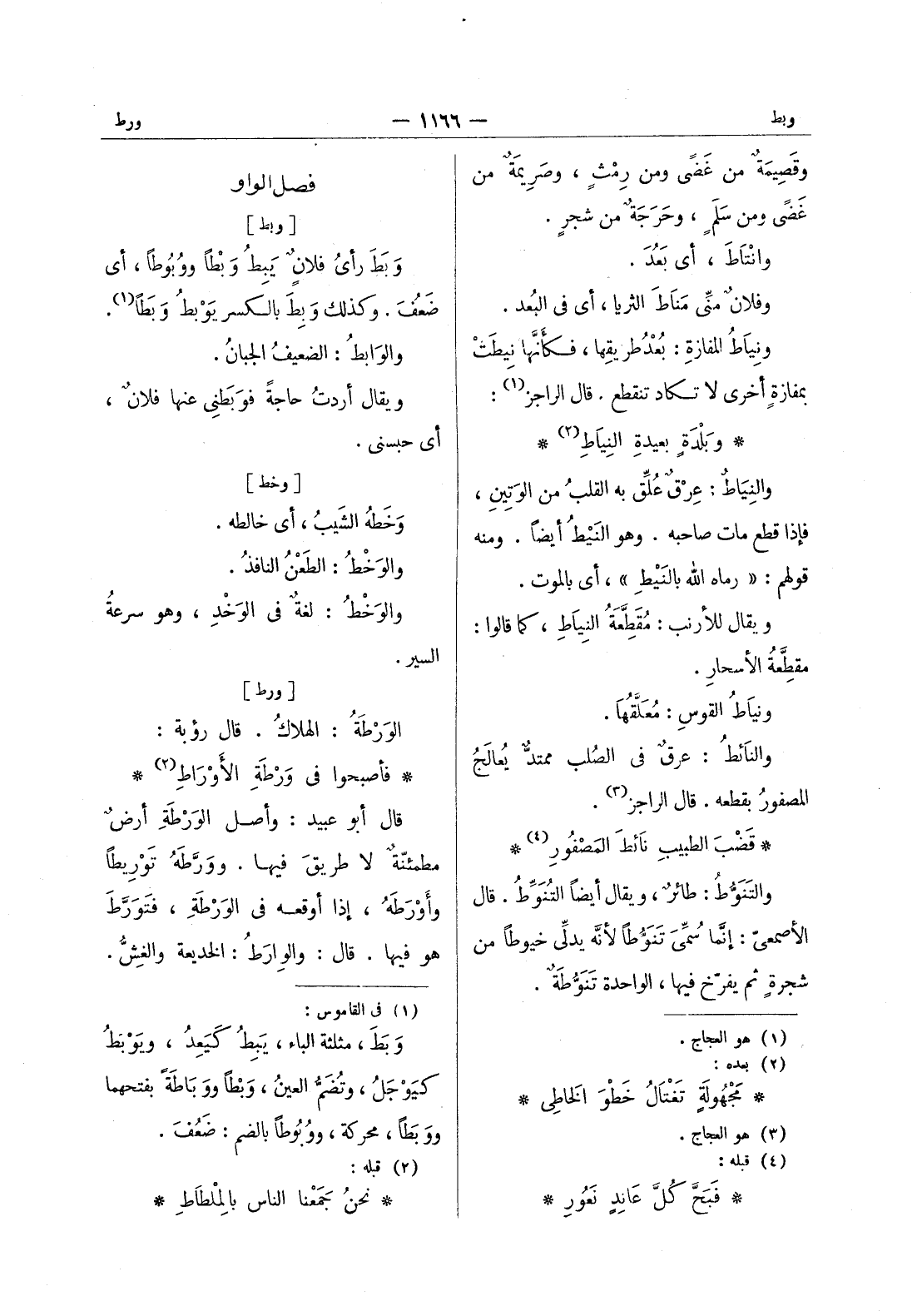 (¬1) في القاموس: وبط، مثلثة الباء، يبط كيعد، ويوبط كيوجل، وتضم العين، وبطا ووباطة بفتحهما ووبطا، محركة، ووبوطا بالضم: ضعف.