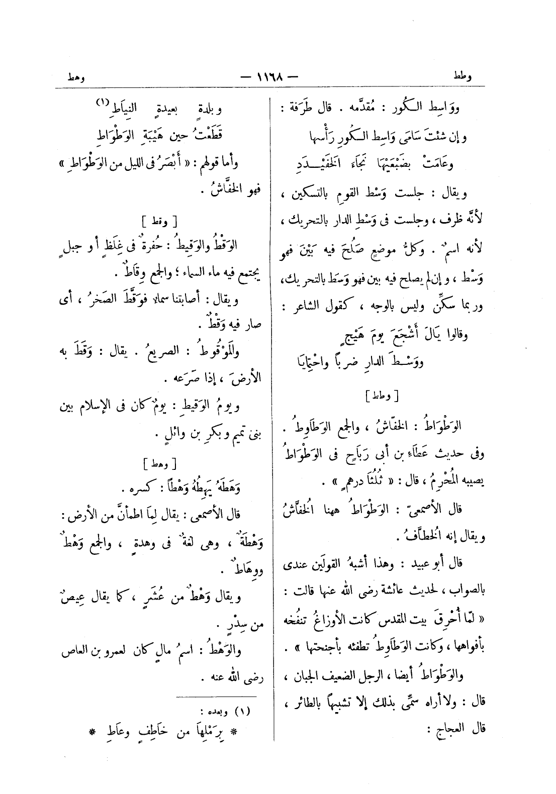 [وهط] وَهَطَهُ يَهِطُهُ وَهْطاً: كسره. قال الأصمعيّ: يقال لما اطمأَنَّ من الأرض: وَهْطَةٌ، وهي لغةٌ في وَهْدَةٍ، والجمع وَهْطٌ ووِهاطٌ. ويقال وَهْطٌ من عُشَرٍ، كما يقال عيص من سدر. والوهط: اسم مال كان لعمرو بن العاص رضى الله عنه.