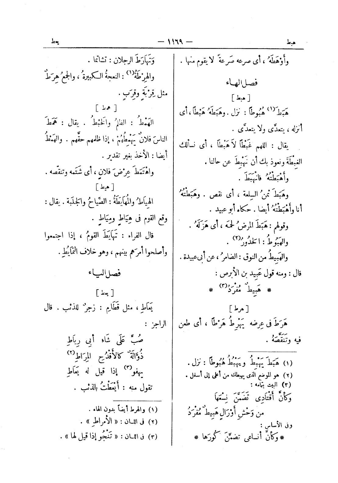 [هيط] الهِياطُ والمُهايَطَةُ: الصياح والجَلَبة. يقال: وقع القوم في هِياطٍ ومِياطٍ. قال الفراء: تهايَطَ القومُ، إذا اجتمعوا وأصلحوا أمرهم بينهم، وهو خلاف التمايط.