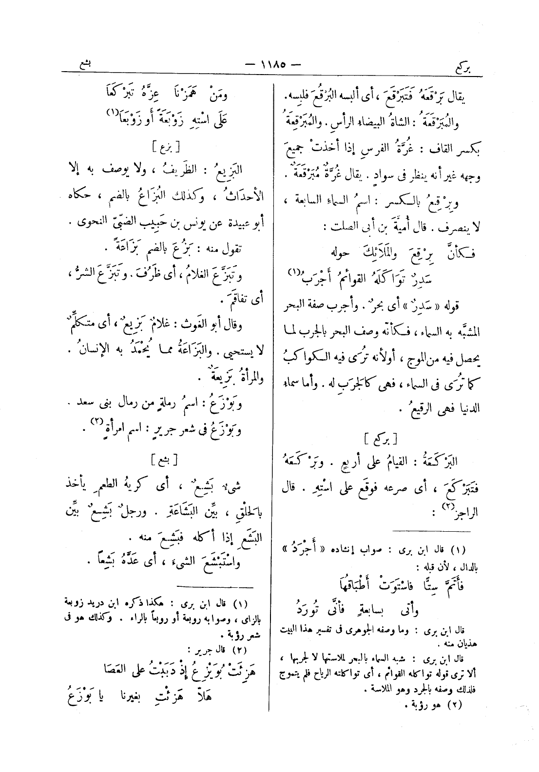 [بزع] البَزيعُ: الظَريفُ، ولا يوصف به إلا الأحدّاثُ، وكذلك البُزاعُ بالضم، حكاه أبو عبيدة عن يونس بن حبيب الضبى النحوي. تقول منه: بزع بالضم بَزاعَةً. وتَبَزَّعَ الغلامُ، أي ظَرُفَ. وتَبَزَّعَ الشرُّ، أي تفاَقَمَ. وقال أبو الغَوث: غلامٌ بَزيعٌ، أي متكلِّمٌ لا يستحيي. والبَزاعَةُ مما يُحْمَدُ به الإنسانُ. والمرأةٌ بَزيعَةٌ. وبوزع: اسم رملة من رمال بنى سعد. وبوزع في شعر جرير: اسم امرأة (¬2) .