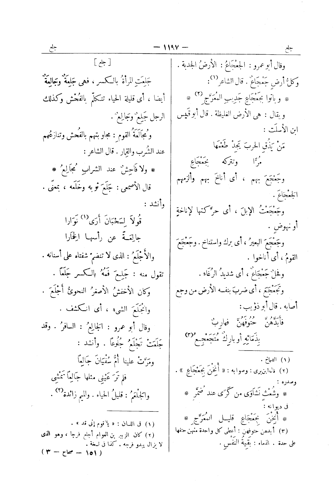 ولا فاحِشٌ عند الشرابِ مُجالِعُ * قال الأصمعي: جَلَعَ ثوبه وخلعه، بمعنى. وأنشد: قولا لسحبان أرى (¬1) نوارا * جالعة عن رأسها الخمارا * والاجلع: الذى لا تنضم شفتاه على أسنانه. تقول منه: جَلِعَ فَمُهُ بالكسر جلعا. وكان الاخفش الاصغر النحوي أجلع. وانجلع الشئ، أي انكشف. وقال أبو عمرو: الجالِعُ: السافرُ. وقد جلعت تجلع جلوعا. وأنشد: ومرت علينا أم سفيان جالعا * فلم تر عينى مثلها جالعا تمشى * والجلعم: قليل الحياء. والميم زائدة (¬2) .