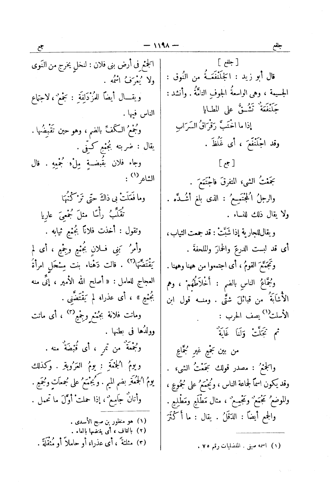 الجَمْعَ في أرض بني فلان: لنخلٍ يخرج من النَوى ولا يُعْرَفُ اسْمُهُ. ويقال أيضاً: للمُزْدَلِفَةِ: جَمْعٌ، لاجتماع الناس فيها. وجُمْعُ الكَفِّ بالضم، وهو حين تَقْبِضُها. يقال: ضربته بجُمْعِ كفّي. وجاء فلان بقُبضةٍ مِلْءِ جُمْعِهِ. قال الشاعر (¬1) : وما فَعَلَتْ بي ذاكَ حتّى تَرَكْتُها * تُقَلِّبُ رأْساً مثلَ جُمْعيَ عارِيا * وتقول: أخذت فلاناً بجُمْعٍ ثيابه. وأمرُ بَني فلانٍ بجَمْعٍ وجِمْعٍ، أي لم يَقْتَضَّها (¬2) . قالت دَهْناء بنت مِسْحَلٍ امرأةُ العجاج للعامل: " أصلح الله الأمير، إنِّي منه بجُمْعٍ "، أي عذراء لم يَقْتَضَّني. وماتت فلانة بجُمْعٍ وجِمْعٍ (¬3) ، أي ماتت وولدُها في بطنها. وجُمْعَةٌ من تمرٍ، أي قُبْضَةٌ منه. ويومُ الجُمْعَةِ: يومُ العَروبةِ. وكذلك يومُ الجُمُعَةِ بضم الميم. ويُجْمَعُ على جُمُعاتٍ وجُمَعٍ. وأتانٌ جامِعٌ، إذا حملتْ أوَّلَ ما تحمل.