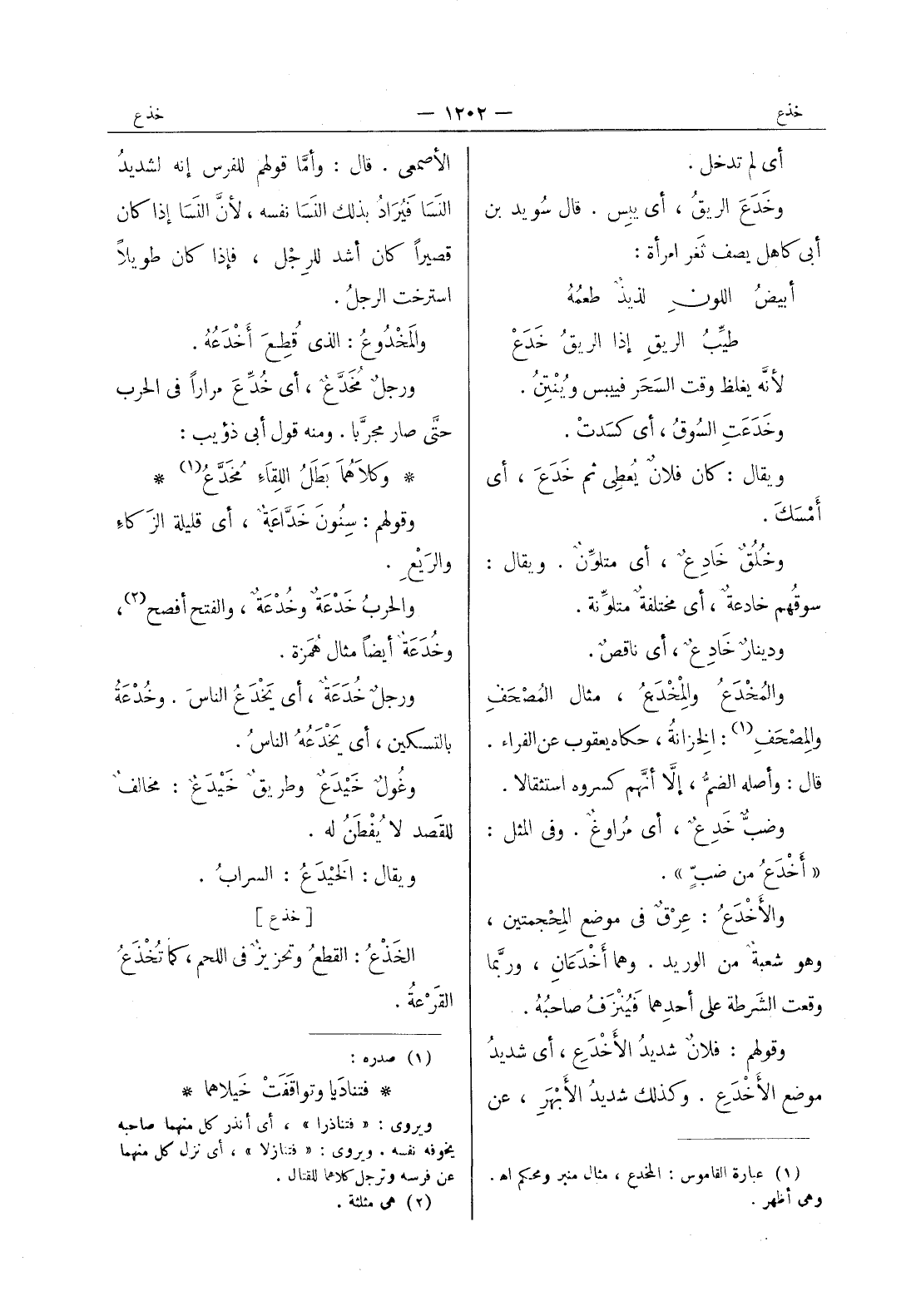 أي لم تدخل. وخَدَعَ الريقُ، أي يبِس. قال سويد بن أبي كاهل يصف ثَغر امرأة: أبيضُ اللونِ لذيذٌ طعمُهُ * طيِّبُ الريقِ إذا الريقُ خَدَعْ * لأنَّه يغلظ وقت السَحَر فييبس ويُنْتِنُ. وخَدَعَتِ السوقُ، أي كسَدَتْ. ويقال: كان فلانٌ يُعطي ثم خَدَعَ، أي أمْسَكَ. وخُلُقٌ خادِعٌ، أي متلوِّنٌ. ويقال: سوقُهم خادعةٌ، أي مختلفةٌ متلوِّنةٌ. ودينارٌ خادِعٌ، أي ناقصٌ. والمخدع والمخدع، مثال المصحف والمصحف (¬1) : الخزانة، حكاه يعقوب عن الفراء. قال: وأصله الضم، إلا أنهم كسروه استثقالا. وضب خدع، أي مُراوغٌ. وفي المثل: " أَخْدَعُ من ضَبٍّ ". والأَخْدَعُ: عِرْقٌ في موضع المِحْجمتين، وهو شعبة من الوريد. وهما أَخْدَعانِ، وربَّما وقعت الشَرطة على أحدِهما فَيُنْزَفُ صاحبُهُ. وقولهم: فلانٌ شديدُ الأَخْدَعِ، أي شديدُ موضِع الأَخْدَعِ. وكذلك شديدُ الابهر، عن