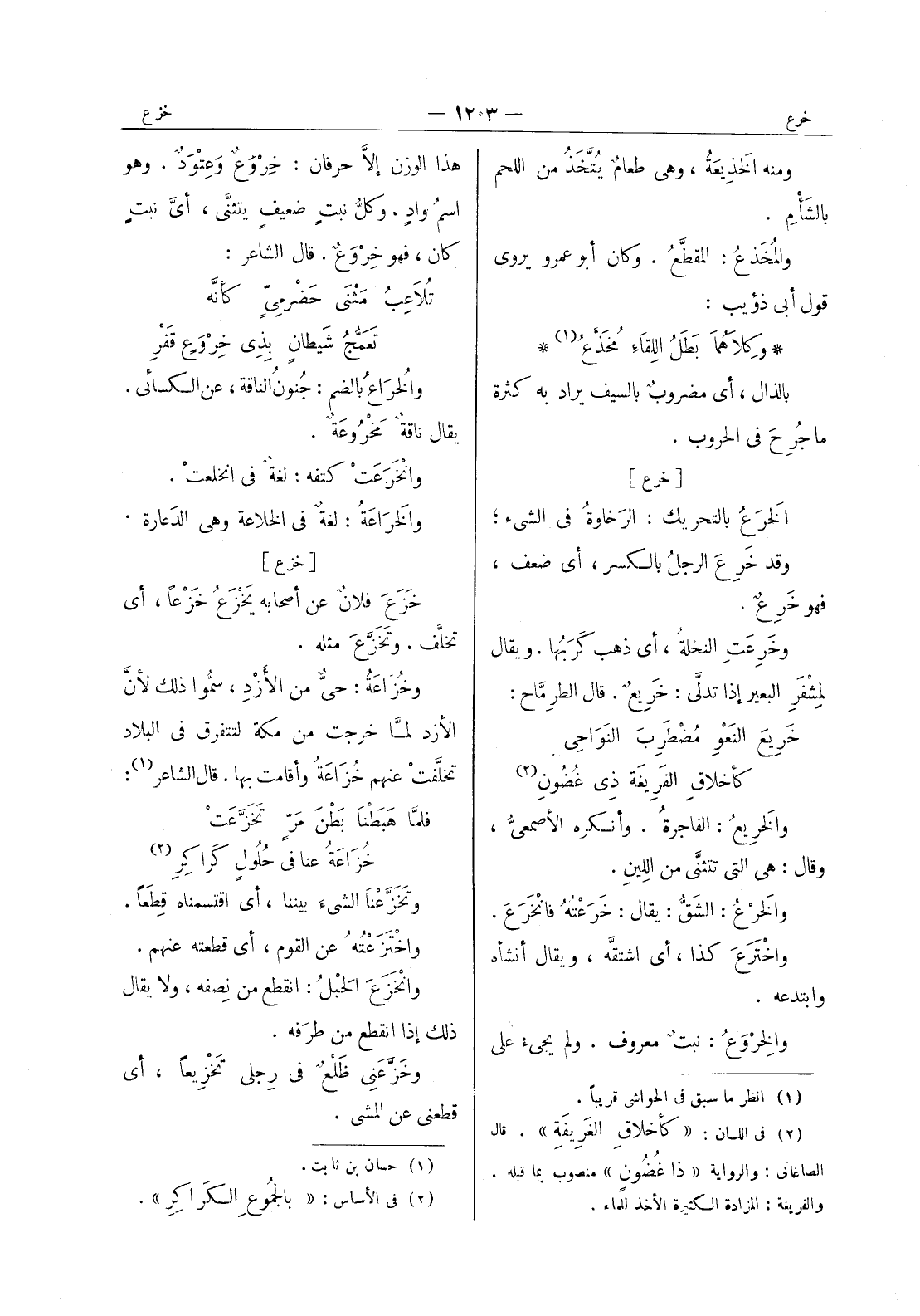 [خزع] خَزَعَ فلانٌ عن أصحابه يَخْزَعُ خَزْعاً، أي تخلّف. وتَخَزَّعَ مثله. وخزاعة: حى من الازد، سموا ذلك لان الازد لما خرجت من مكة لتتفرق في البلاد تخلفت عنهم خزاعة وأقامت بها. قال الشاعر (¬1) : فلما هبطنا بطن مر تخزعت * خزاعة عنا في حلول كراكر (¬2) * وتخزعنا الشئ بيننا، أي اقتسمناه قِطَعاً. واخْتَزَعْتُهُ عن القوم، أي قطعته عنهم. وانْخَزَعَ الحَبْلُ: انقطع من نِصفه، ولا يقال ذلك إذا انقطع من طرَفه. وخَزَّعَني ظَلْعٌ في رِجلي تَخْزيعاً، أي قطعني عن المشى.
