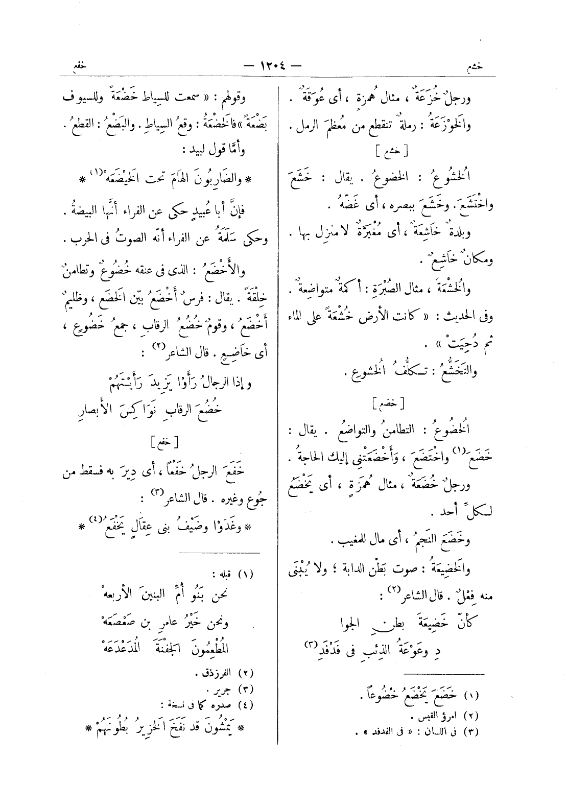 [خضم] الخضوع: التطامن والتواضع. يقال: خَضَعَ (¬1) واخْتَضَعَ، وَأَخْضَعَتْني إليك الحاجةُ. ورجلٌ خُضَعَةٌ، مثال هُمَزَةٍ، أي يَخْضَعُ لكلِّ أحد. وخَضَعَ النَجمُ، أي مال للمغيب. والخضيعة: صوت بَطْن الدابة ; ولا يُبْنى منه فعل. قال الشاعر (¬2) : كأن خضيعة بطن الجوا * د وعوعة الذئب في فدفد (¬3) *