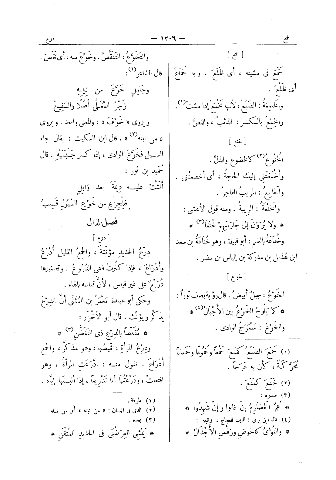 مقلصا بالدرع ذى التغضن (¬3) * ودِرْعُ المرأةِ: قميصُها، وهو مذكَّر، والجمع أَدْراعٌ. تقول منه: ادَّرَعَتِ المرأةُ، وهو افتعلتْ، ودَرَّعْتُها أنا تدريعا، إذا ألبستها إياه.