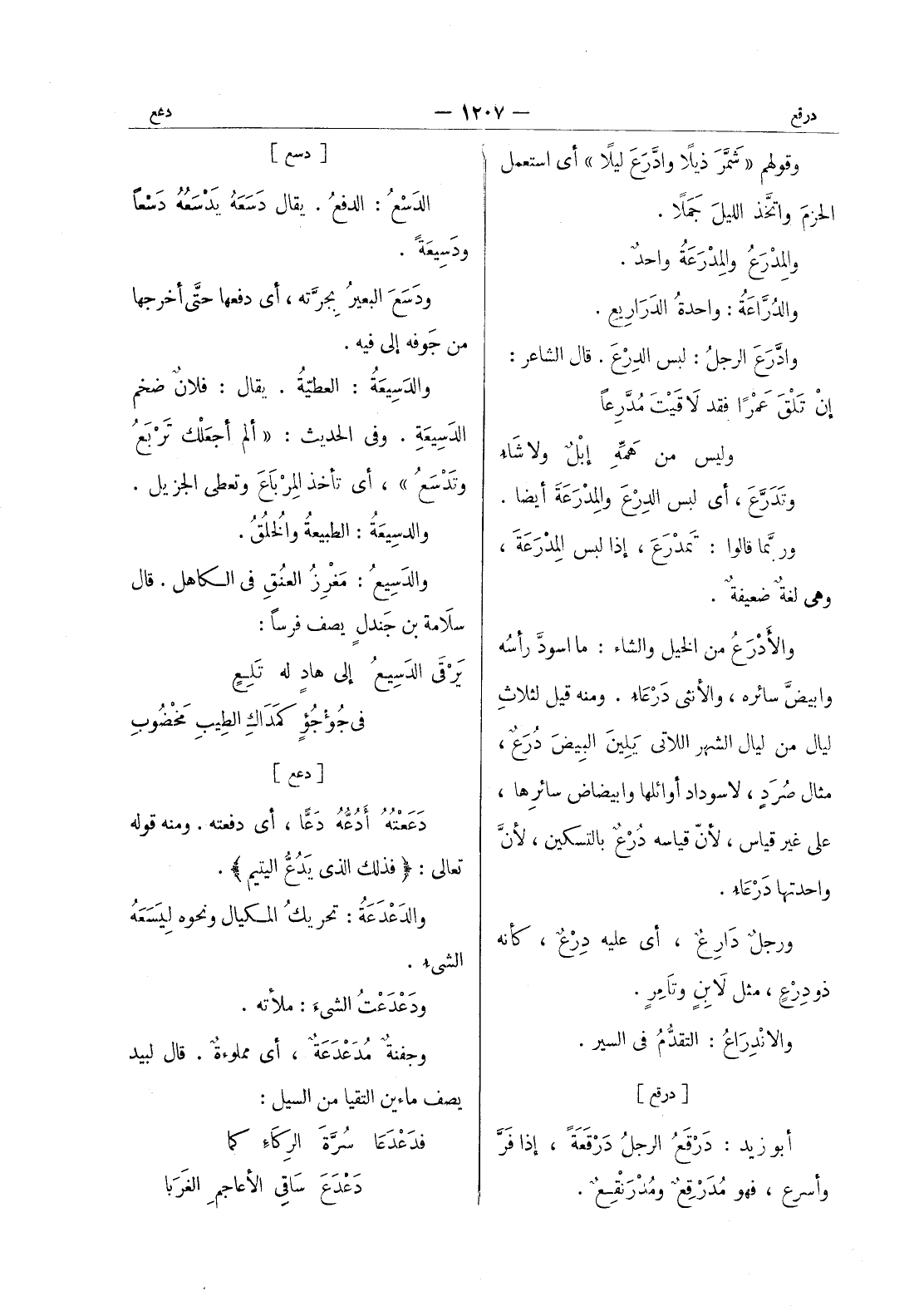 وقولهم " شَمَّرَ ذيلاً وادَّرَعَ ليلاً " أي استعمل الحزمَ واتَّخذ الليلَ جَمَلاً. والمِدْرَعُ والمِدْرَعَةُ واحدٌ. والدُرَّاعَةُ: واحدةُ الدَراريع. وادَّرَعَ الرجلُ: لبس الدِرْعَ. قال الشاعر: إنْ تَلْقَ عَمْراً فقد لاقَيْتَ مُدَّرعاً * وليس من هَمِّهِ إبْلٌ ولا شاءُ * وتَدَرَّعَ، أي لبس الدرع والمدرعة أيضا. وربما قالوا: تمدرع، إذا لبس المدرعة، وهى لغة ضعيفة. والأدْرَعُ من الخيل والشاء: ما اسود رأسه وابيض سائره، والانثى درعاء. ومنه قيل لثلاث ليال من ليال الشهر اللاتى يلين البيض درع، مثال صرد، لاسوداد أوائلها وابيضاض سائرها، على غير قياس، لان قياسه درع بالتسكين، لان واحدتها درعاء. ورجلٌ دارِعٌ، أي عليه دِرْعٌ، كأنه ذو درع، مثل لابن وتامر. والاندراع: التقدم في السير.