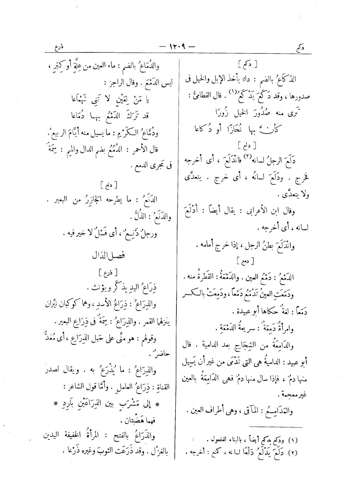 [دلع] دَلَعَ الرجلُ لسانه (¬2) فانْدَلَعَ، أي أخرجه فخرج. ودَلعَ لسانُه، أي خرج. يتعدَّى ولا يتعدَّى. وقال ابن الأعرابي: يقال أيضاً: أَدْلَعَ لسانه، أي أخرجه. وانْدَلَعَ بطنُ الرجل، إذا خرج أمامه.