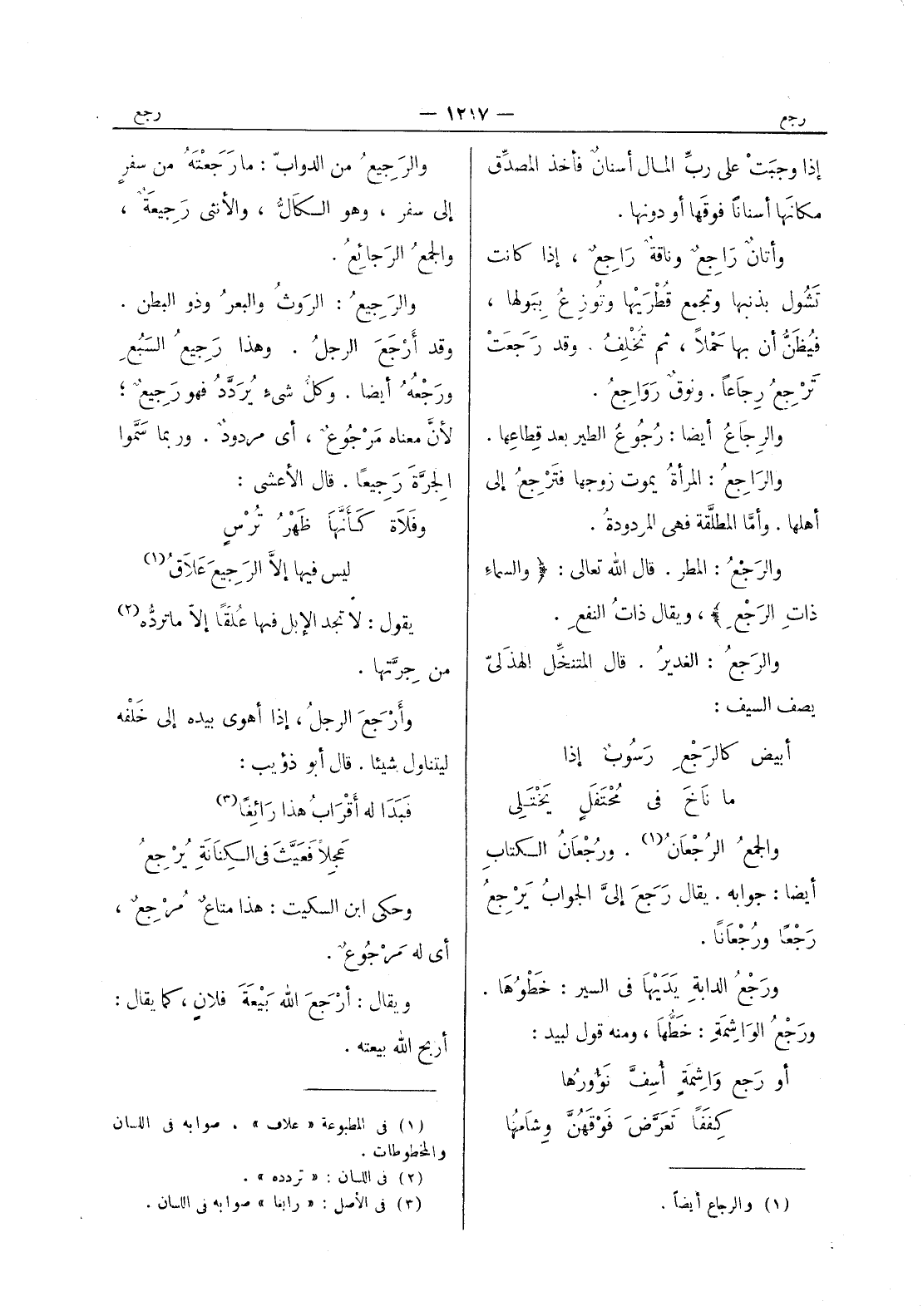 إذا وجبَتْ على ربِّ المال أسنانٌ فأخذ المصدِّق مكانَها أسناناً فوقَها أو دونها. وأتانٌ راجِعٌ وناقةٌ راجِعٌ، إذا كانت تَشول بذنبها وتجمع قُطْرَيْها وتوزِعُ بِبَولها، فيُظَنُّ أن بها حَمْلاً، ثم تُخْلِفُ. وقد رَجَعَتْ تَرْجِعُ رِجاعاً. ونوقٌ رَواجِعُ. والرِجاعُ أيضاً: رُجوعُ الطير بعد قِطاعِها. والراجِعُ: المرأةُ يموت زوجها فترْجِعُ إلى أهلها. وأمَّا المطلَّقة فهي المردودة. والرَجْعُ: المطر. قال الله تعالى: {والسماءِ ذاتِ الرَجْعِ} ، ويقال ذاتُ النفعِ. والرَجْعُ: الغديرُ. قال المتنخِّل الهذَليّ يصف السيف: أبيض كالرَجْعِ رَسوبٌ إذا * ما ناخَ في مُحْتَفَلٍ يَخْتَلي * والجمعُ الرُجْعانُ (¬1) . ورُجْعانُ الكتابِ أيضاً: جوابه. يقال رَجَعَ إليَّ الجوابُ يَرْجِعُ رَجْعاً ورُجْعاناً. ورَجْعُ الدابةِ يَدَيْها في السير: خَطْوُها. ورَجْعُ الواشمة: خطها، ومنه قول لبيد: أو رَجْعُ واشِمةٍ أُسِفُّ نَؤُورُها * كففا تعرض فوقهن وشامها *
