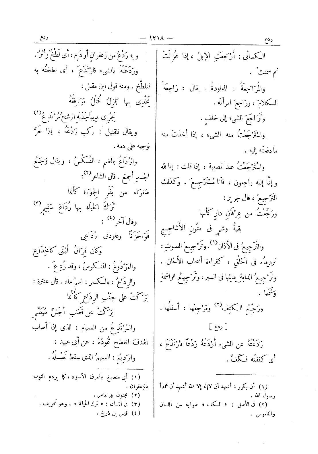 الكسائي: أَرْجَعَتِ الإِبْلُ، إذا هزُلَتْ ثم سمنت. والمراجعة: المعاودة. يقال: راجعَهُ الكلامَ، وراجعَ امرأتَه. وتراجع الشئ إلى خلف. واسترجعت منه الشئ، إذا أخذت منه ما دفعتَه إليه. واسْتَرْجَعْتُ عند المصيبة، إذا قلت: إنا لله وإنَّا إليه راجعون، فأنا مُسْتَرْجِعٌ. وكذلك التَرْجيعُ، قال جرير: ورَجَّعْتُ من عِرْفانِ دارٍ كأنها * بقيةُ وشمٍ في متونِ الأشاجِعِ * والترجيعُ في الأذان (¬1) . وتَرْجيعُ الصوتِ: ترديدُه في الحَلْقِ، كقراءة أصحاب الألحان. وتَرْجيعُ الدابةِ يديْها في السير، وتَرْجيعُ الواشِمةِ وَشْمَها. ورَجْعُ الكتِفِ (¬2) ومرجعها: أسفلها.