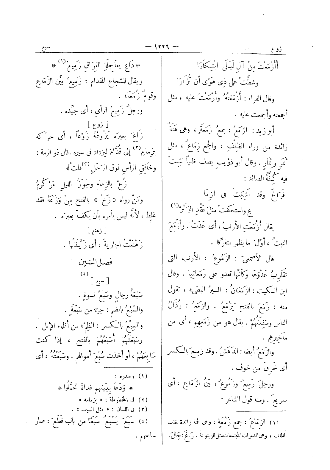 (¬1) الزماع: جمع زمعة، وهى لحمة زائدة خلف الظلف، وهى الشعرات المجتمعات مثل الزيتونة. راغ: جال.