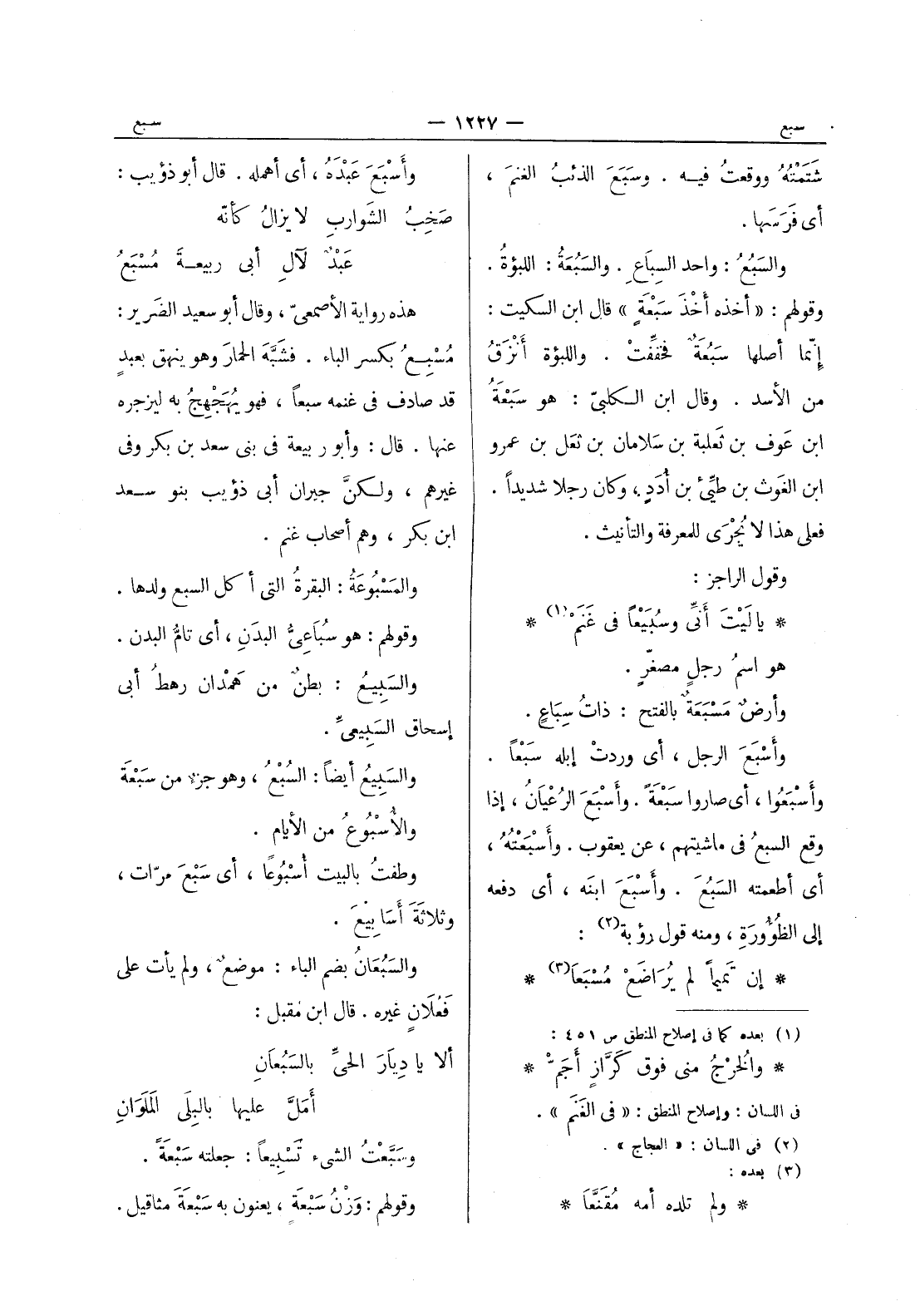 يا ليت أنى وسبيعا في غنم (¬1) * هو اسم رجل مصغر. وأرض مسبعة بالفتح: ذاتُ سِباعٍ. وأَسْبَعَ الرجل، أي وردتْ إبله سَبْعاً وأَسْبَعوا، أي صاروا سَبْعَةً. وأَسْبَعَ الرُعْيانُ، إذا وقع السبعُ في ماشيتهم، عن يعقوب. وأَسْبَعْتُهُ، أي أطعمته السَبُعَ. وأَسْبَعُ ابنَه، أي دفعه إلى الظُؤُورَةِ، ومنه قول رؤبة (¬2) :