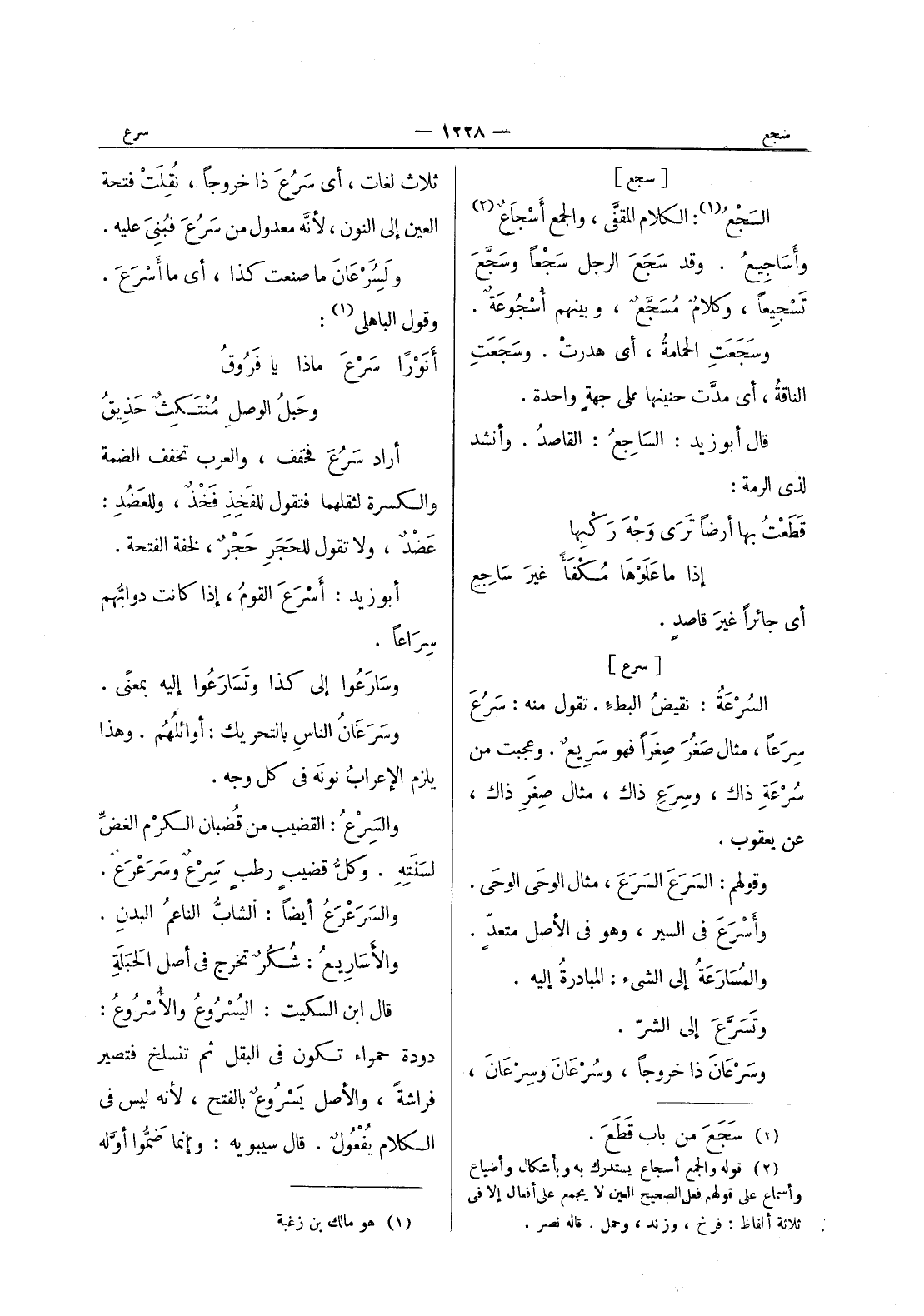 ثلاث لغات، أي سرع ذا خروجا، نقلت فتحة العين إلى النون، لانه معدول من سرع فبنى عليه. ولسرعان ما صنعت كذا، أي ما أَسْرَعَ. وقول الباهلى (¬1) : أنورا سرع ماذا يا فروق * وحبل الوصل منتكث حذيق * أراد سرع فخفف، والعرب تخفف الضمة والكسرة لثقلهما فتقول للفخذ فخذ، وللعضد: عضد، ولا تقول للحجر حجر، لخفة الفتحة: أبو زيد: أَسْرَعَ القومُ، إذا كانت دوابُّهم سِراعاً. وسارَعوا إلى كذا وتسارعوا إليه بمعنى. وسرغان الناس بالتحريك: أوائلهم. وهذا يلزم الاعراب نونه في كل وجه. والسرع: القضيب من قضبان الكرم الغض لسنته. وكل قضيب رطب سرع وسرعرع. والسرعرع أيضا: الشاب الناعم البدن. والاساريع: شكر تخرج في أصل الحبلة قال ابن السكيت: اليسروع والاسروع: دودة حمراء تكون في البقل ثم تنسلخ فتصير فراشة، والاصل يسروع بالفتح، لانه ليس في الكلام يفعول. قال سيبويه: وإنما ضموا أوله