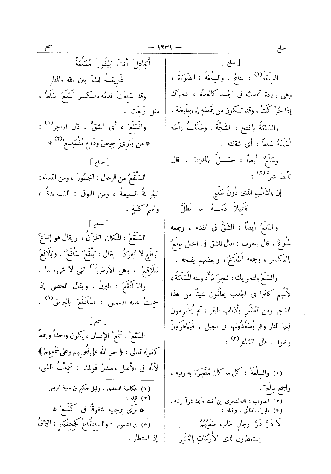 [سلع] السِلْعَةُ (¬1) : المتاعُ. والسِلْعَةُ: الضَوَاةُ، وهي زيادة تحدث في الجسد كالغدّة، تتحرَّك إذا حُرِّكَتْ، وقد تكون حمصة إلى بطيخة. والسَلْعَةُ بالفتح: الشَجَّةُ. وسَلَعْتُ رأسَه أسلعه سلعا، أي شققته. وسلع أيضا: جبل بالمدينة. قال تأبط شرا (¬2) : إن بالشعب الذى دون سلع * لقتيلا دمه ما يطل * والسلع أيضاً: الشَقُّ في القدم، وجمعه سُلوعٌ. قال يعقوب: يقال للشق في الجبل سلع بالسكسر، وجمعه أَسْلاعٌ، وبعضهم يفتحه. والسَلَعُ بالتحريك: شجر مر، ومنه المسلعة، لانهم كانوا في الجدب يعلقون شيئا من هذا الشجر ومن العشر بأذناب البقر، ثم يضرمون فيها النار وهم يصعدونها في الجبل، فيمطرون زعموا. قال الشاعر (¬3)