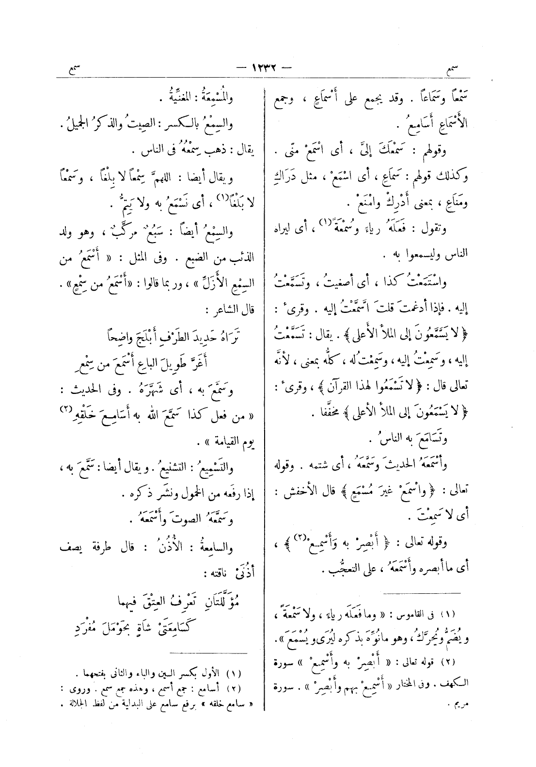 سمعا وسماعا. وقد يجمع على أَسْماعٍ، وجمع الأَسْماعِ أَسامِعُ. وقولهم: سَمْعَكَ إليَّ، أي اسْمَعْ منّي. وكذلك قولهم: سَماعِ، أي اسْمَعْ، مثل دَراكِ ومَناعِ، بمعنى أَدْرِكْ وامْنَعْ. وتقول: فَعَلَهُ رياءً وسُمْعَةً (¬1) ، أي ليراه الناس وليسمعوا به. واسْتَمَعْتُ كذا، أي أصغيتُ، وتَسَمَّعْتُ إليه. فإذا أدغمتَ قلتَ اسَّمَّعْتُ إليه. وقرئ: {لا يَسَّمَّعُونَ إلى الملأ الأعلى} . يقال: تَسَمَّعْتُ إليه، وسَمِعْتُ إليه، وسَمِعْتُ له، كله بمعنى، لانه تعالى قال: {لا تسمعوا لهذا القرآن} ، وقرئ: {لا يسمعون إلى الملا الاعلى} مخففا. وتسامع به الناسُ. وأَسْمَعَهُ الحديثَ وسَمَّعَهُ، أي شتمه. وقوله تعالى: {واسْمَعْ غَيرَ مسمع} قال الاخفش: أي لا سمعت. وقوله تعالى: {أبصر به وأَسْمِعْ (¬2) } ، أي ما أبصره وأَسْمَعَهُ، على التعجب.