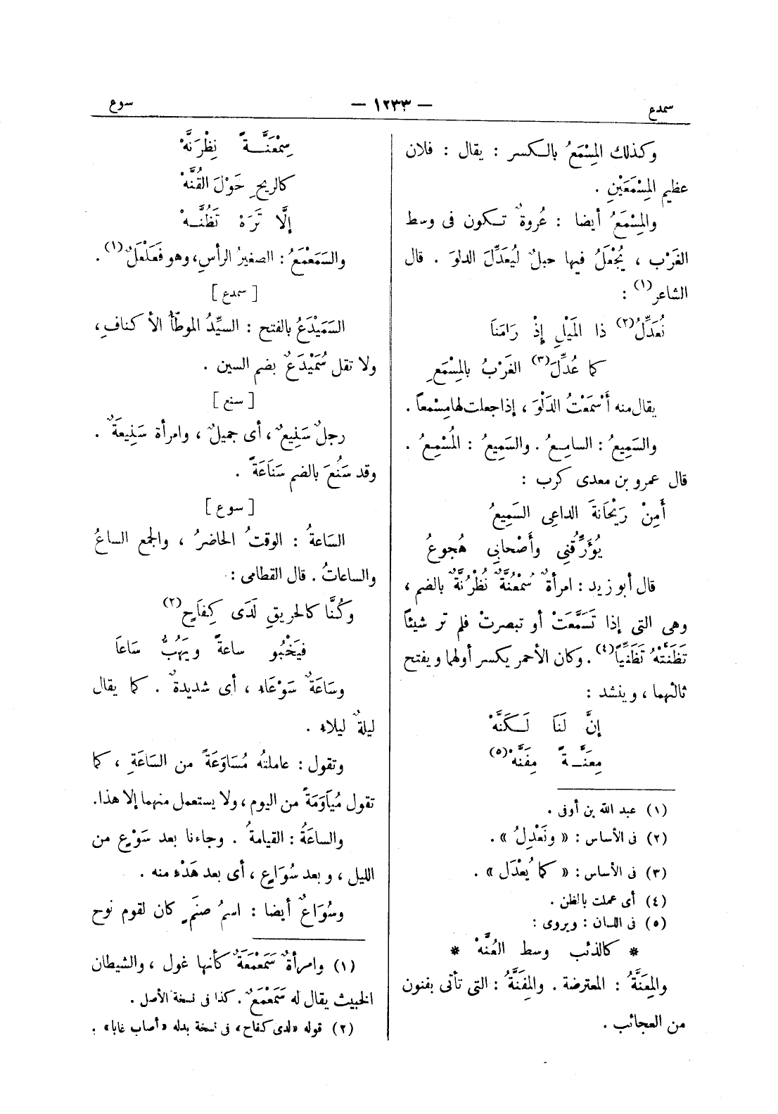 وكذلك المِسْمَعُ بالكسر: يقال: فلان عظيم المِسْمَعَيْنِ. والمِسْمَعُ أيضاً: عُروةٌ تكون في وسط الغَرْب، يُجْعَلُ فيها حبلٌ ليُعَدِّلَ الدَلوَ. قال الشاعر (¬1) : نُعَدِّلُ (¬2) ذا المَيْلِ إذْ رامَنا * كما عُدِّلَ (¬3) الغَرْبُ بالمِسْمَعِ * يقال منه أَسْمَعْتُ الدلْوَ، إذا جعلت لها مِسْمعاً والسَميعُ: السامَعُ. والسَميعُ: المُسْمِعُ. قال عمرو بن معدي كرب: أَمِنْ رَيْحانَةَ الداعي السَميعُ * يُؤَرِّقُني وأَصْحابي هُجوعُ * قال أبو زيد: امرأةٌ سُمْعُنَّةٌ نُظْرُنَّةٌ بالضم، وهي التي إذا تَسَمَّعَتْ أو تبصرتْ فلم تر شيئاً تظنته تظنيا (¬4) . وكان الاحمر يكسر أولهما ويفتح ثالثهما، وينشد: إن لنا لكنه * معنة مفنه (¬5) *