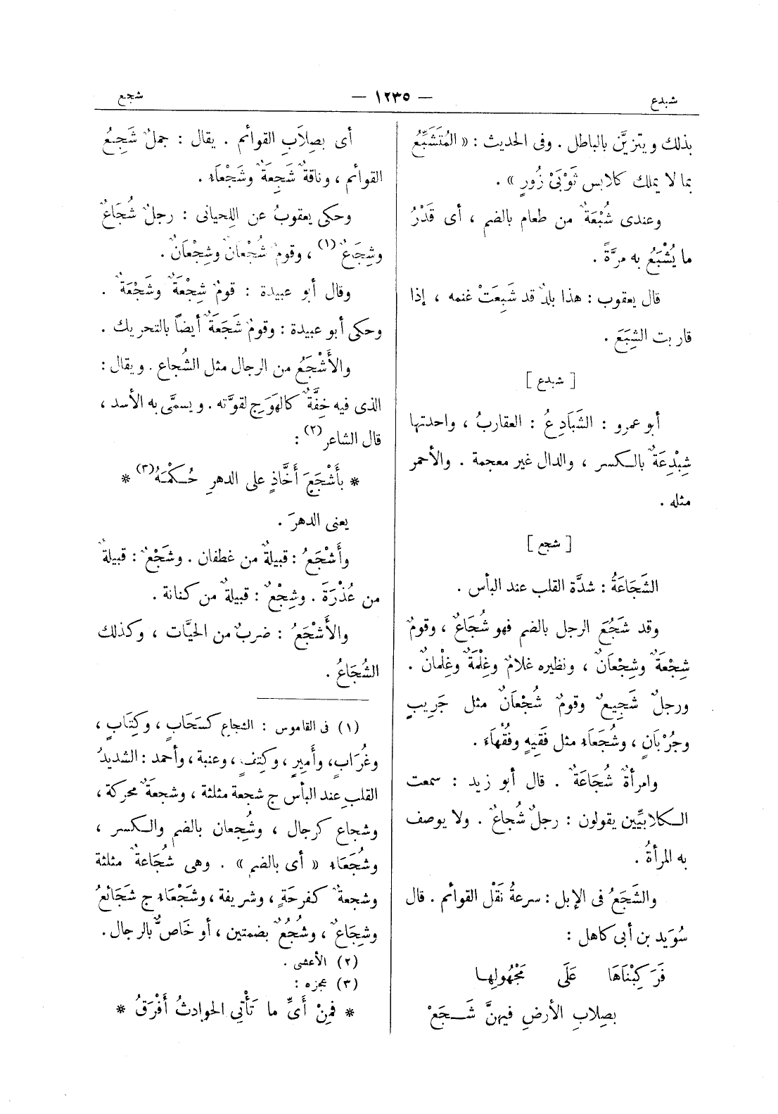 (¬1) في القاموس: الشجاع كسحاب، وكتاب، وغراب، وأمير، وكتف، وعنبة، وأحمد: الشديد القلب عند البأس ج شجعة مثلثة، وشجعة محركة، وشجاع كرجال، وشجعان بالضم والكسر، وشجعاء " أي بالضم ". وهى شجاعة مثلثة وشجعة كفرحة، وشريفة، وشجعاء ج شجائع وشجاع، وشجع بضمتين، أو خاص بالرجال.