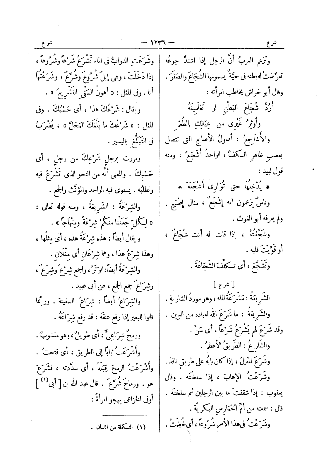 وشرعت الدواب في الماء تَشْرَعُ شَرْعاً وشُروعاً، إذا دَخَلَتْ، وهي إبلٌ شُروعٌ وشُرَّعٌ، وشَرَعْتُها أنا. وفي المثل: " أهونُ السَقْي التَشْريعُ ". ويقال: شَرْعُكَ هذا، أي حَسْبُكَ. وفي المثل: " شَرْعُكَ ما بَلَّغَكَ المَحَلَّ "، يُضْرَبُ في التبلغ باليسير. ومررت برجل شرعك من رجلٍ، أي حَسْبِكَ. والمعنى أنَّه من النحو الذي تَشْرَعُ فيه وتطلُبه. يستوي فيه الواحد والمؤنَّث والجمع. والشِرْعَةُ: الشَريعَةُ، ومنه قوله تعالى: " لِكُلٍّ جَعَلْنا منكُمْ شِرْعَةً ومِنْهاجاً ". ويقال أيضاً: هذه شِرْعَةُ هذه، أي مِثلُها، وهذا شِرْعُ هذا، وهما شِرْعانِ أي مِثْلانِ. والشِرْعَةُ أيضاً: الوَتَرُ، والجمع شِرْعٌ وشِرَعٌ، وشِراعٌ جمع الجمع، عن أبي عبيد. والشِراعُ أيضاً: شِراعُ السفينةِ. وربَّما قالوا للبعير إذا رفع عنقَه: قد رفع شِراعَهُ. ورمحٌ شِراعِيٌّ، أي طويلٌ، وهو منسوبٌ. وأَشْرَعَتُ باباً إلى الطريق، أي فتحتُ. وأَشْرَعْتُ الرمحَ قِبَلَهُ، أي سدَّدته، فشَرَعَ هو. ورماح شرع. قال عبد الله بن