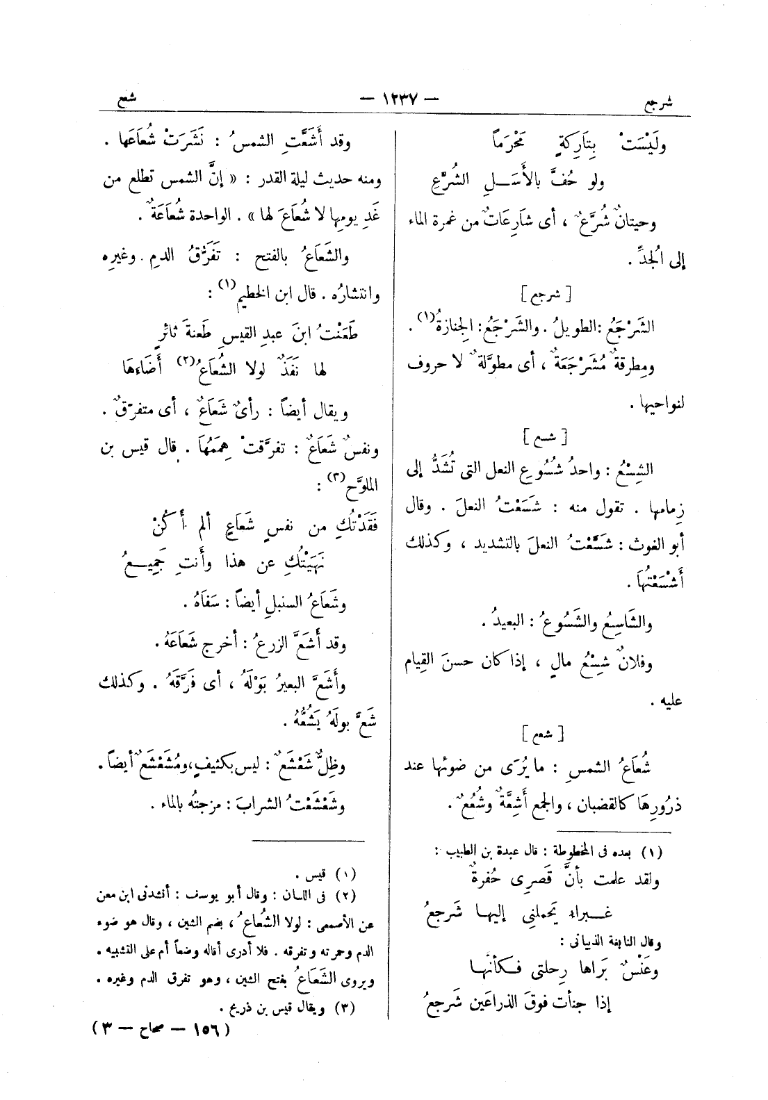 وقد أشعت الشمسُ: نَشَرَتْ شُعاعَها. ومنه حديث ليلة القدر: " إنَّ الشمسَ تطلع من غَدِ يومِها لا شُعاعَ لها ". الواحدة شُعاعَةٌ. والشَعاعُ بالفتح: تَفَرُّقُ الدمِ وغيرِه وانتشارُه. قال ابن الخطيم (¬1) : طَعَنْتُ ابنَ عبدِ القيسِ طَعنةَ ثائرٍ * لها نَفَذٌ لولا الشُعاعُ (¬2) أَضاَءها * ويقال أيضاً: رأيٌ شَعاعٌ، أي متفرّقٌ. ونفسٌ شَعاعٌ: تفرَّقَتْ هِمَمُها. قال قيس بن الملوَّح (¬3) : فَقَدْتُكِ من نفسٍ شَعاعٍ ألم أَكُنْ * نَهَيْتُكِ عن هذا وأَنتِ جَميعُ * وشَعاعُ السنبلِ أيضاً: سَفاهُ. وقد أَشَعَّ الزرعُ: أخرج شعاعَهُ. وأَشَعَّ البعيرُ بَوْلَهُ، أي فَرَّقَهُ. وكذلك شَعَّ بولَهُ يشعه. وظل شعشع: ليس بكثيف، ومُشَعْشَعٌ أيضاً. وشَعْشَعْتُ الشرابَ: مزجتُه بالماء.