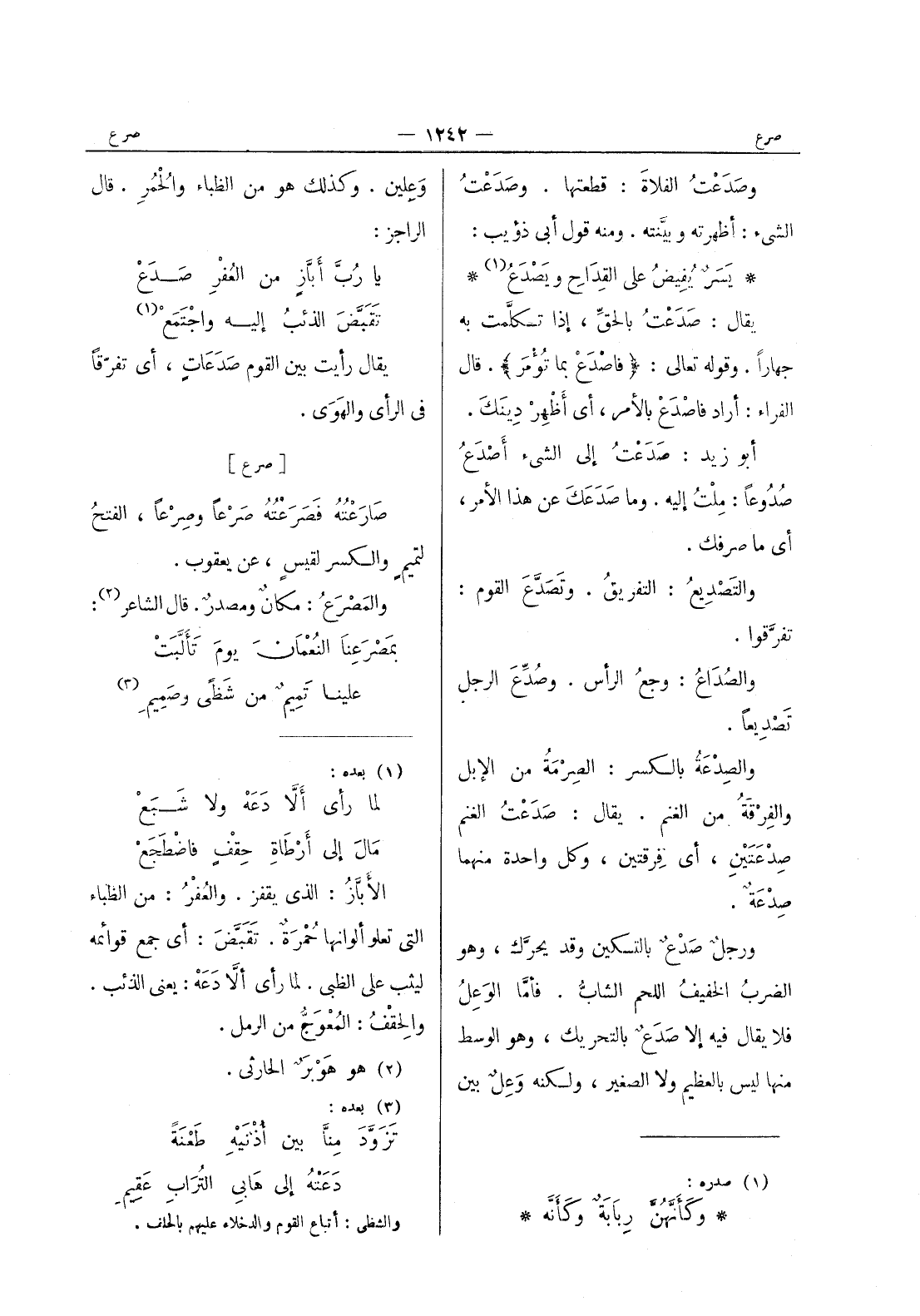 يَسَرٌ يُفيضُ على القِداحِ ويَصْدَعُ (¬1) * يقال: صَدَعْتُ بالحقِّ، إذا تكلّمت به جهاراً. وقوله تعالى: {فاصْدَعْ بما تُؤْمَر} . قال الفراء: أراد فاصْدَعْ بالأمر، أي أَظْهِرْ دينَكَ. أبو زيد: صدعت إلى الشئ أصدع صُدوعاً: مِلْتُ إليه. وما صَدَعَكَ عن هذا الأمر، أي ما صرفك. والتَصْديعُ: التفريقُ. وتَصَدَّعَ القوم: تفرَّقوا. والصُداعُ: وجعُ الرأس. وصُدِّعَ الرجل تَصْديعاً. والصِدْعَةُ بالكسر: الصِرْمَةُ من الإبل والفِرْقَةُ من الغنم. يقال: صَدَعْتُ الغنم صِدْعَتَيْنِ، أي فِرْقتين، وكل واحدة منهما صِدْعَةٌ. ورجلٌ صَدْعٌ بالتسكين وقد يحرَّك، وهو الضربُ الخفيفُ اللحم الشابُّ. فأمَّا الوَعِلُ فلا يقال فيه إلا صَدَعٌ بالتحريك، وهو الوسط منها ليس بالعظيم ولا الصغير، ولكنه وعل بين
