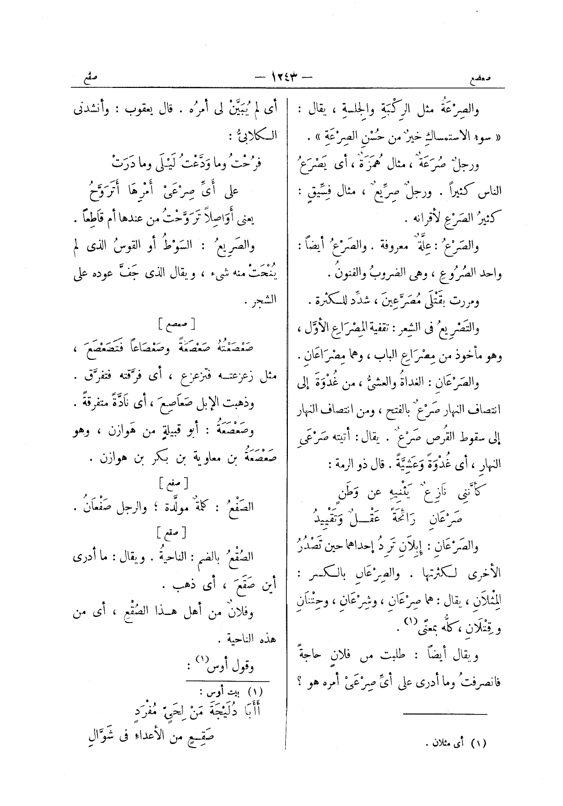 والصرعة مثل الركبة والجلسة، يقال: " سوء الاستمساكِ خيرٌ من حُسْنِ الصِرْعَةِ ". ورجل صرعة، مثال همزة، أي يصرع الناس كثيرا. ورجل صريع مثال فسيق: كثير الصرع لأقرانه. والصَرْعُ: عِلَّةٌ معروفة. والصَرْعُ أيضاً: واحد الصُروعِ، وهي الضُروبُ والفنونُ. ومررت بقَتْلى مُصَرَّعينَ، شدِّد للكثرة. والتَصْريعُ في الشِعر: تقفية المِصْراعِ الأوَّل، وهو مأخوذ من مِصْراعِ الباب، وهما مِصْراعانِ. والصَرْعانِ: الغداةُ والعشيُّ، من غُدْوَةَ إلى انتصاف النهار صَرْعٌ بالفتح، ومن انتصاف النهار إلى سقوط القرص صرع. يقال: أتيته صرعى النهارِ، أي غُدْوَةً وَعَشِيَّةً. قال ذو الرمة: كأنني نازِعٌ يَثْنيهِ عن وَطَنٍ * صَرْعانِ رائحَةً عَقْلٌ وَتَقْييدُ * والصَرْعانِ: إبِلانِ تَرِدُ إحداهما حين تَصْدُرُ الأخرى لكثرتها. والصِرْعانِ بالكسر: المِثْلانِ، يقال: هما صِرْعانِ، وشِرْعانِ، وحِتْنانِ وقِتْلانِ، كلُّه بمعنىً (¬1) . ويقال أيضاً: طلبت من فلانٍ حاجةً فانصرفتُ وما أدري على أيِّ صِرْعَيْ أمره هو؟