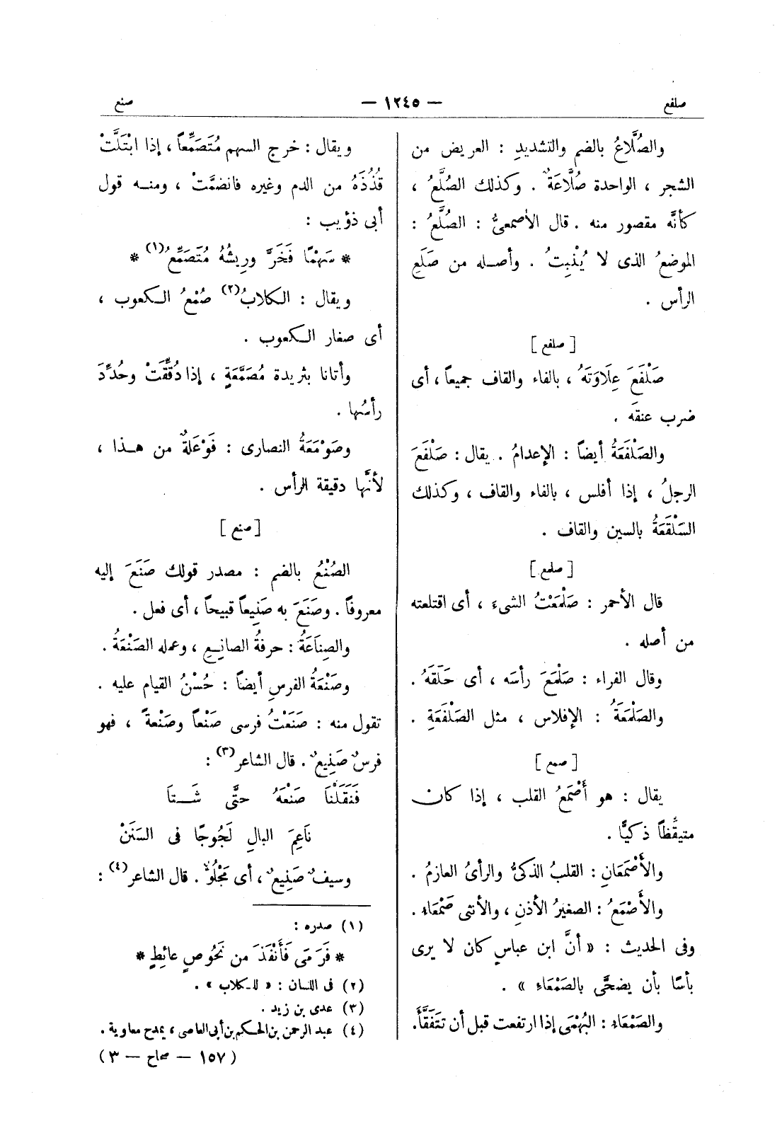سهما فخر وريشه متصمع (¬1) * ويقال: الكلاب (¬2) صمع الكعوب، أي صغار الكعوب. وأتانا بثريدة مُصَمَّعَةٍ، إذا دُقِّقَتْ وحُدِّدَ رأسُها. وصَوْمَعَةُ النصارى: فَوْعَلَةٌ من هذا، لانها دقيقة الرأس.